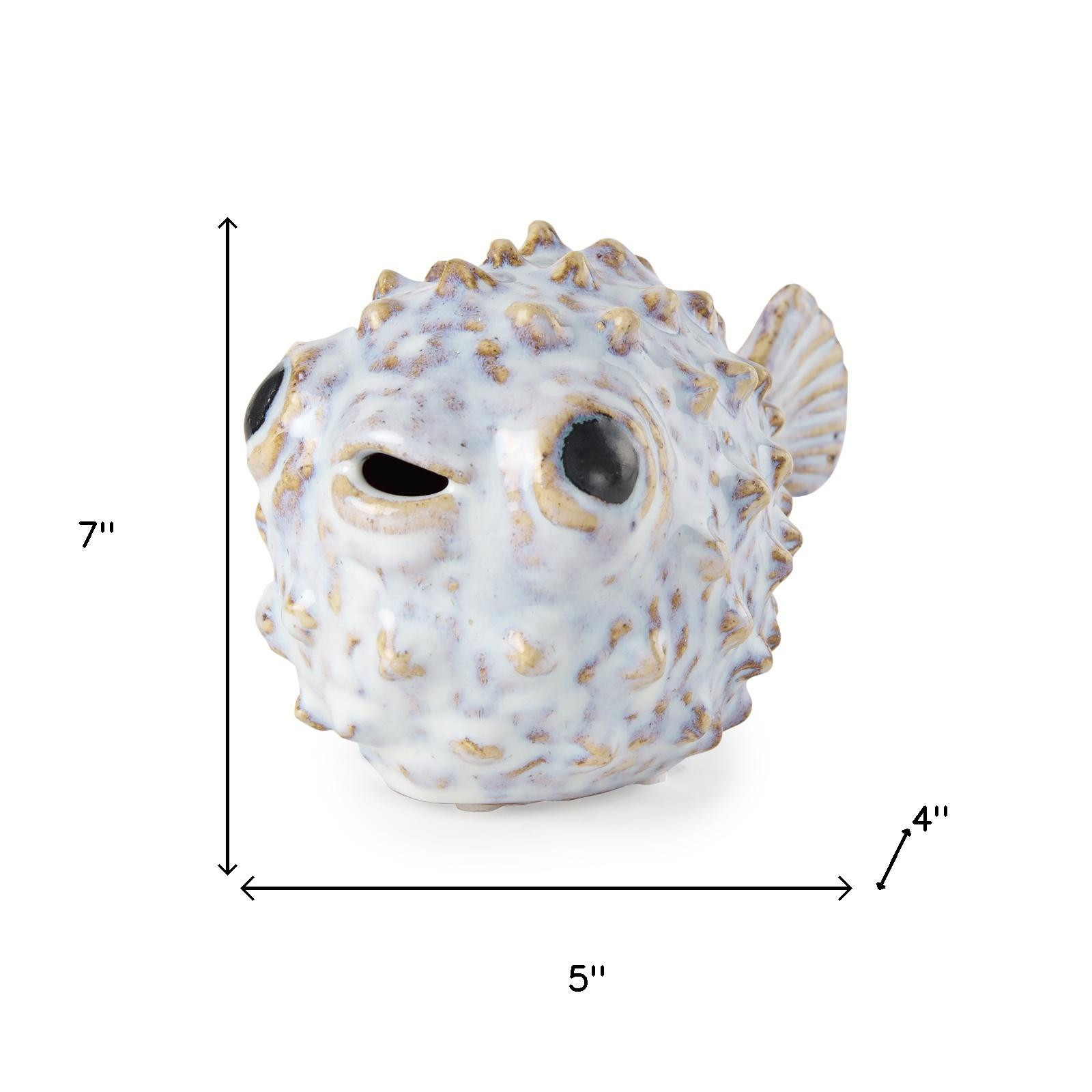 With this Petite Off-White Puffer Fish Sculptureyou can add a touch of whimsical and nautical decor to your home. This piece is made from metal and has a distressed white finish on it that has a few bit of dark gray poking through it here and there. The shape of this decor piece is that of a small puffer fish, There are raised details on the body of this fish as well as big eyes and an open mouth. There are also details on the tail of this piece. All of these details combined with the distressed two tone finish make this decor piece stand out no matter where you use it in your home. The depth and texture of this puffer fish decor piece is sure to catch everyone's eye. 5" H x 4" W x 7" D