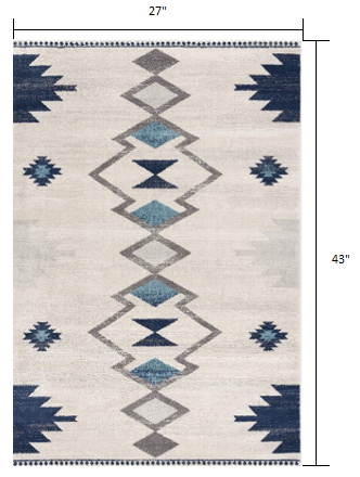 This 2-foot x 4-foot blue and ivory southwestern area rug, is a great way to add warmth to a room. This rectangle shaped rug features a southwestern design in blue and ivory to give it visual interest. A classic shape marries with good looking design for your space place this area rug against a hardwood or tile floor and it will enliven your living space with style and sophistication. 27-inch H x 43-inch W x 0.4-inch D