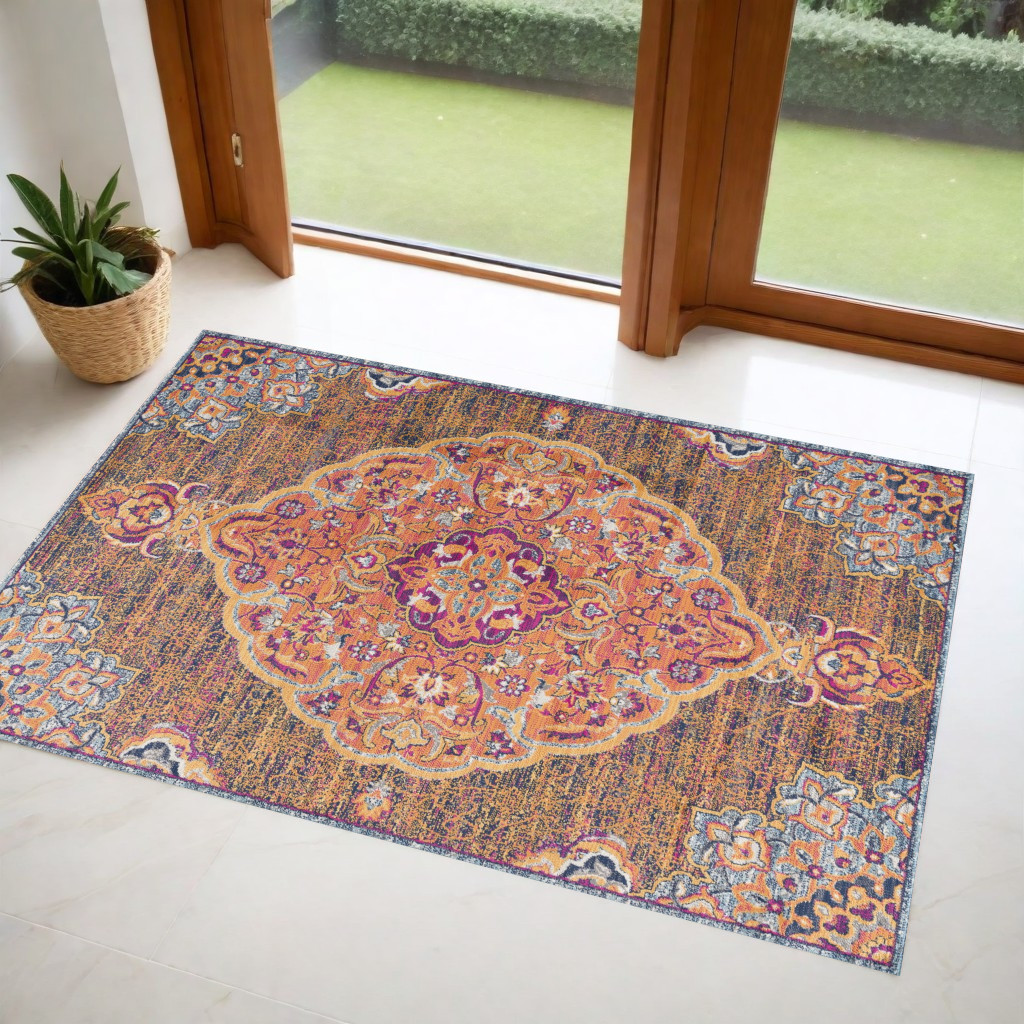 Encouraging an essence of rich traditional styling, this Rustic Orange Medallion Area Rug exhibits a blend of saturated hues to uphold a sense of extravagance into your living space. The exaggerated medallion in the center is intricately decorated with rustic orange, gold, magenta, and tints of blue on a multi-toned base for visual harmony. Ideal for indoor areas with heavy foot traffic, this rug is made in Turkey with 100% polypropylene that speaks of its durability and stain resistance to last long and retain its pristine look for ages. The low pile construction adds to a refined look offering a smooth surface texture with a lustrous effect that feels as luxurious as it looks. Flaunting warm-toned hues and traditional patterns, this alluring area rug will add a sense of energy and vibrance to your traditional home. 43” x 27” x 0.4”