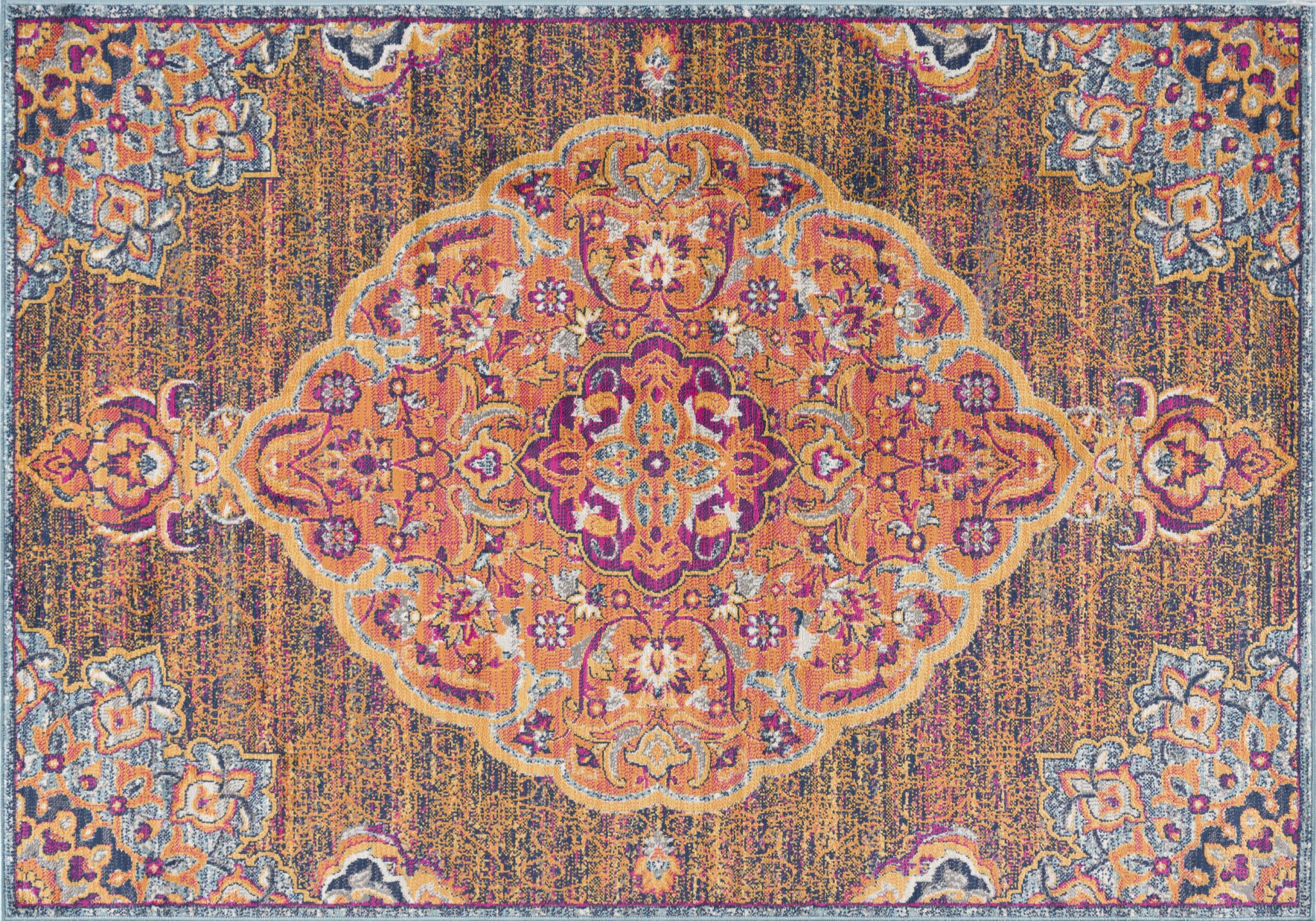 Encouraging an essence of rich traditional styling, this Rustic Orange Medallion Area Rug exhibits a blend of saturated hues to uphold a sense of extravagance into your living space. The exaggerated medallion in the center is intricately decorated with rustic orange, gold, magenta, and tints of blue on a multi-toned base for visual harmony. Ideal for indoor areas with heavy foot traffic, this rug is made in Turkey with 100% polypropylene that speaks of its durability and stain resistance to last long and retain its pristine look for ages. The low pile construction adds to a refined look offering a smooth surface texture with a lustrous effect that feels as luxurious as it looks. Flaunting warm-toned hues and traditional patterns, this alluring area rug will add a sense of energy and vibrance to your traditional home. 129” x 93” x 0.4”