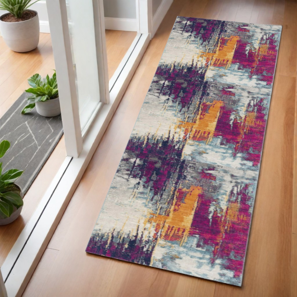 This 6-foot gray ivory and magenta abstract runner rug, is a great way to add warmth to a room. Built to last, this rug crafted from polypropylene fibers is known for its durability and long lasting appeal. Rugs are a great way to showcase your style, hide imperfections, warm your home and reduce noise. This rectangular shaped rug features a abstract design that will add a functional and decorative accent to your space. This modern style runner makes a great accent for the hallway, in front of cabinets, in the laundry room, or any other space you need a narrow and long rug. 27-inch h x 67-inch w x 0.4-inch d.