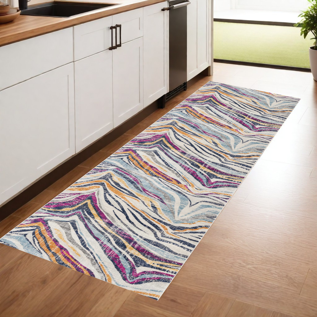 Add great coloration and comfortable texture to your space with this 8-foot blue and gold abstract runner rug. Built to last, this rug crafted from polypropylene fibers is known for its durability and long lasting appeal. Rugs are a great way to showcase your style, hide imperfections, warm your home and reduce noise. This rectangular shaped rug features a abstract design that will add a functional and decorative accent to your space. This modern style runner makes a great accent for the hallway, in front of cabinets, in the laundry room, or any other space you need a narrow and long rug. 27-inch h x 96-inch w x 0.4-inch d.