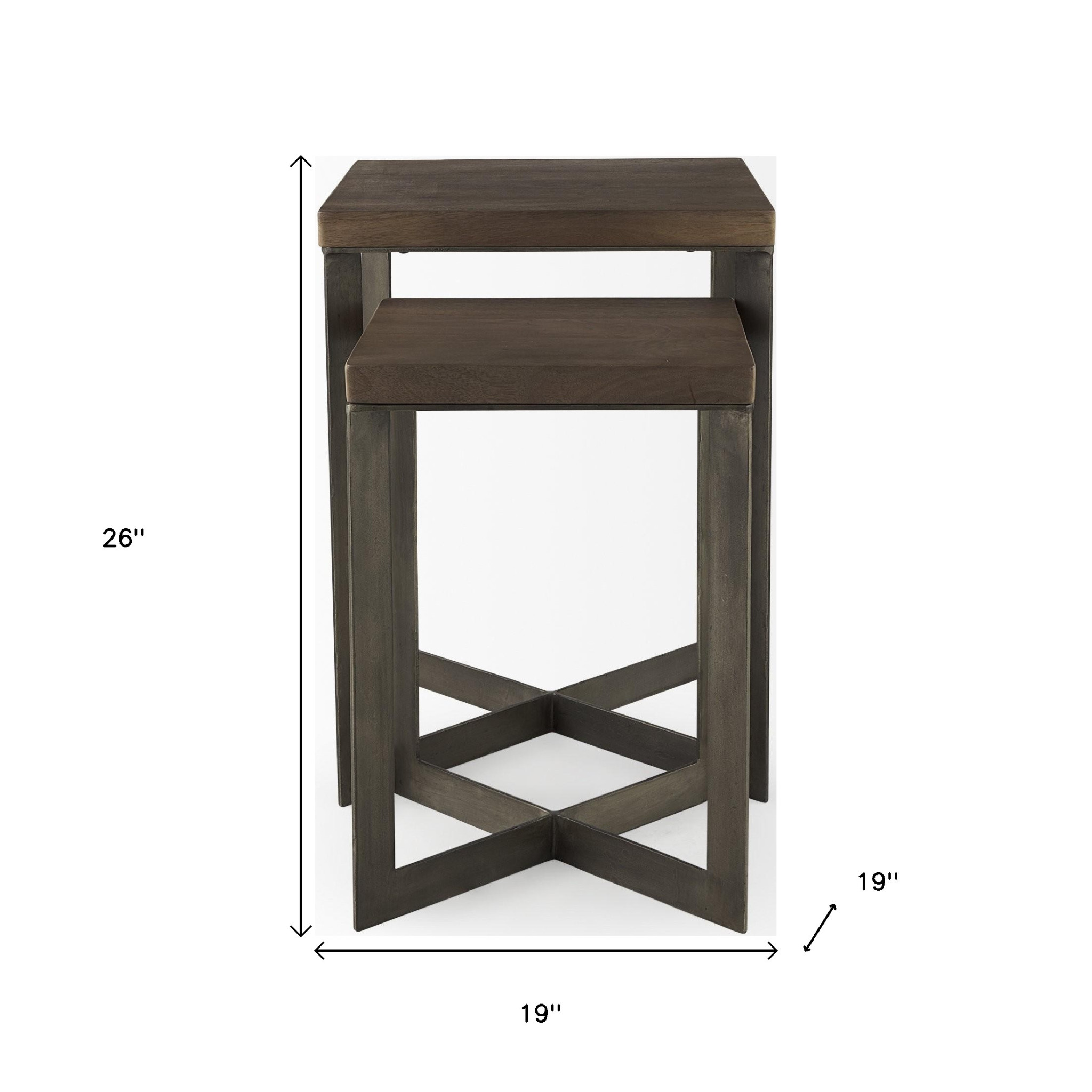 Show off your exquisite taste with this set of two brown solid wood and metal square cross legs nested tables. The nesting feature is a great space saver for when not in use. A solid brown metal frame is finished off with a matching brown solid wood seat, giving this table a chic monotone look. A great accent on either side of the sofa or bed, this adorable end or side table is just what you need. You can match it with other pieces to get the ideal look for your place. 26.00-inch h x 19.00-inch w x 19.00-inch d.