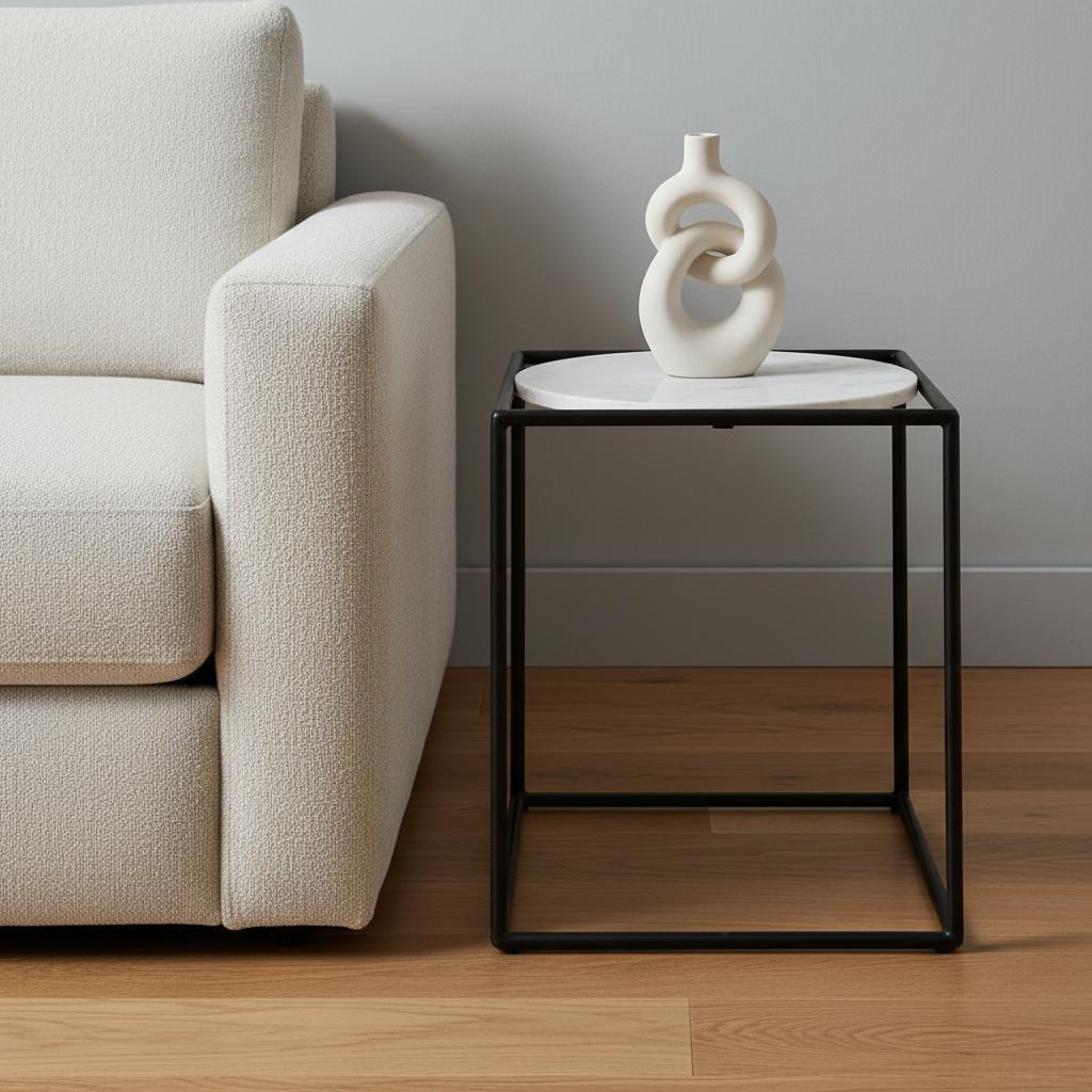 Distinctive in style the 22-inch black marble round end table radiates a versatile charm. The black coloration runs throughout this good looking metal and marble table. Side tables are a great way to flank your sofa, use as an accent next to your favorite chair, or can even be used bedside. You can also use it as an entryway table to hold your keys. 22-inch H x 20-inch W x 20-inch D