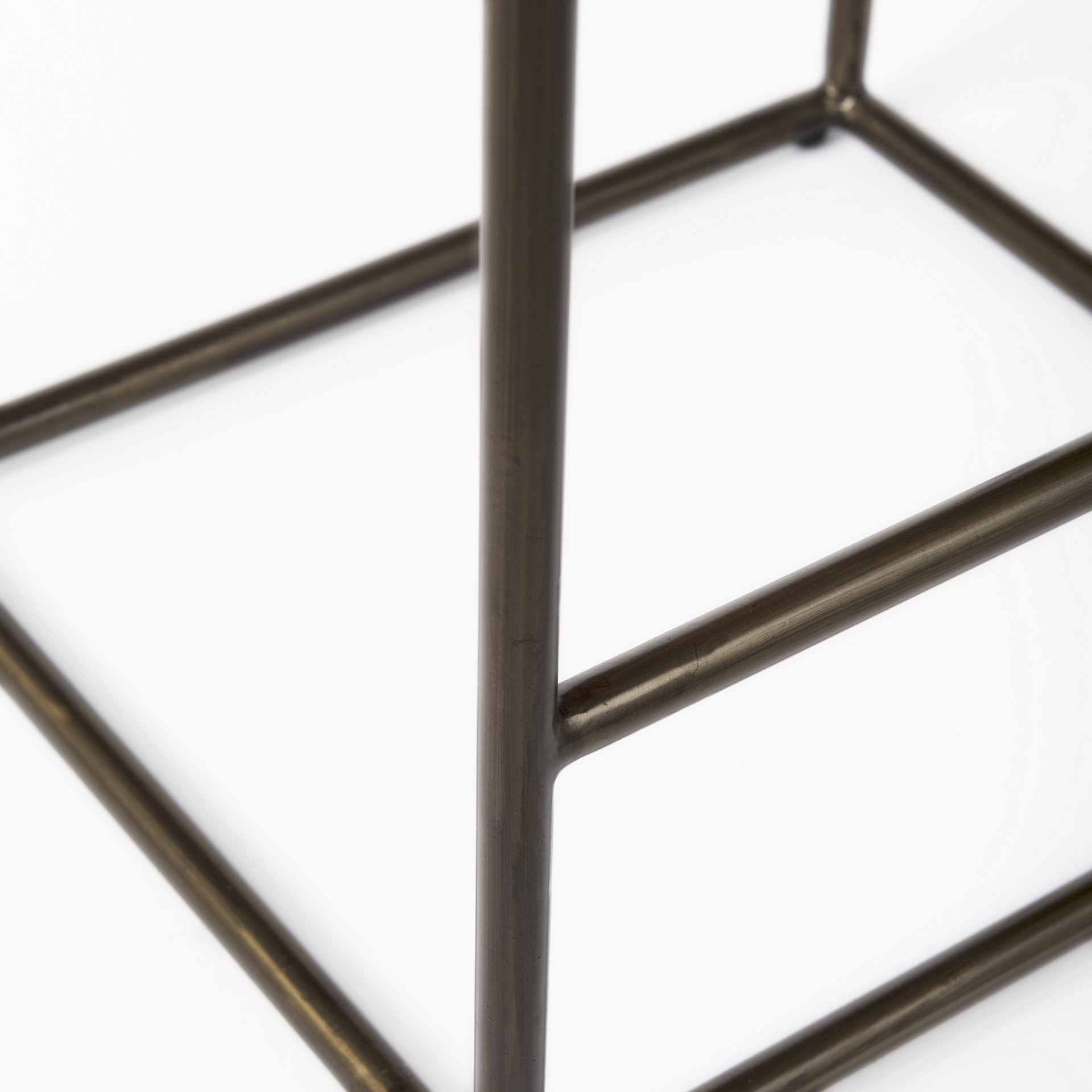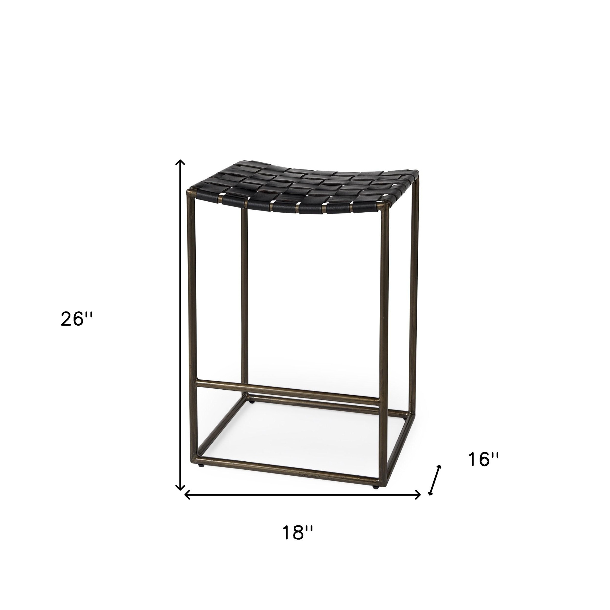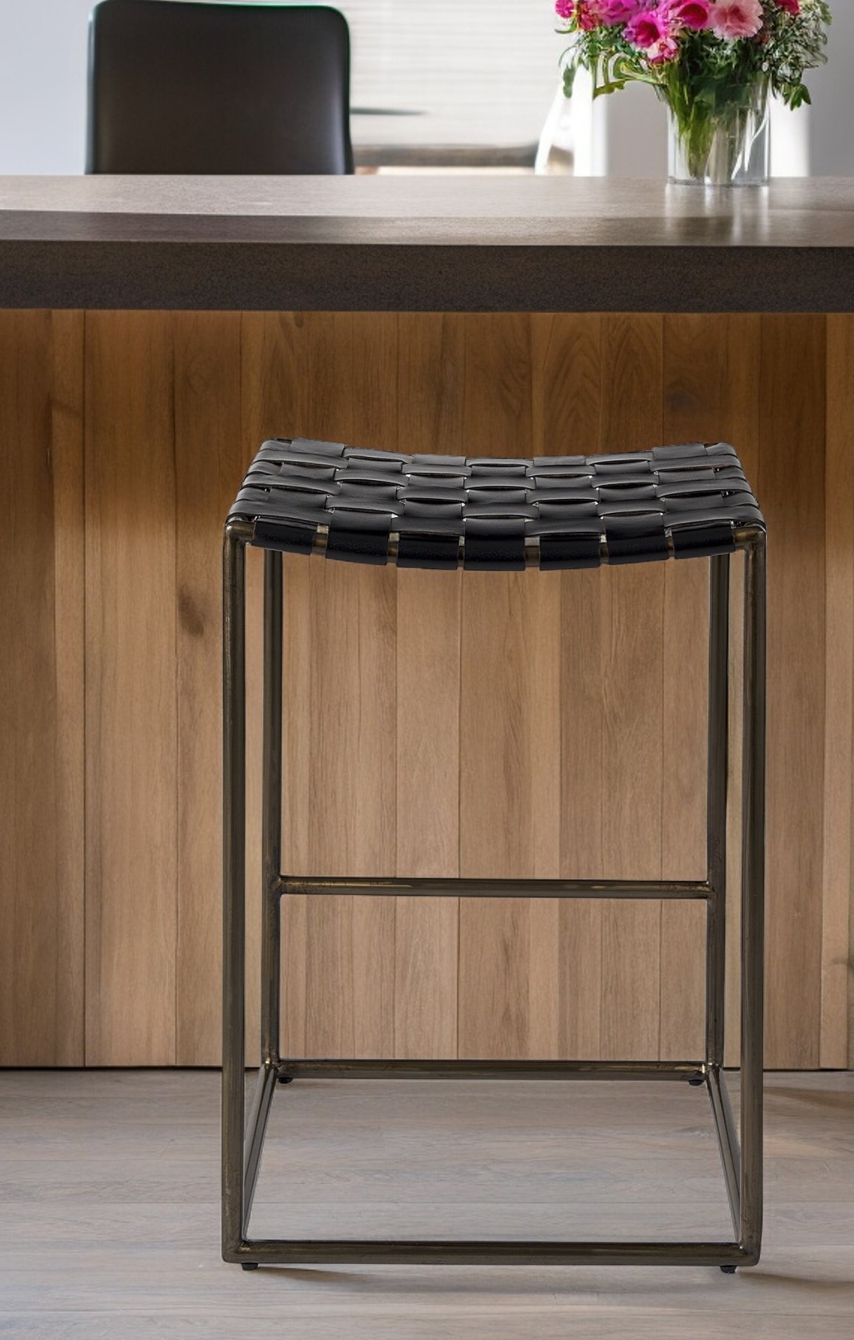 Elevate your home bar with this 29-inch backless bar chair featuring a luxurious leather seat and a sleek bronze metal frame. The built-in footrest ensures comfort while you enjoy your drinks. Its industrial style in black color adds a trendy touch to your space, making it feel like a chic urban retreat. Perfect for creating a cool and stylish ambiance reminiscent of trendy cafes and pubs, this bar chair is both functional and visually appealing. 26-inch h x 16-inch w x 18-inch d.