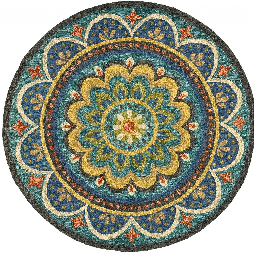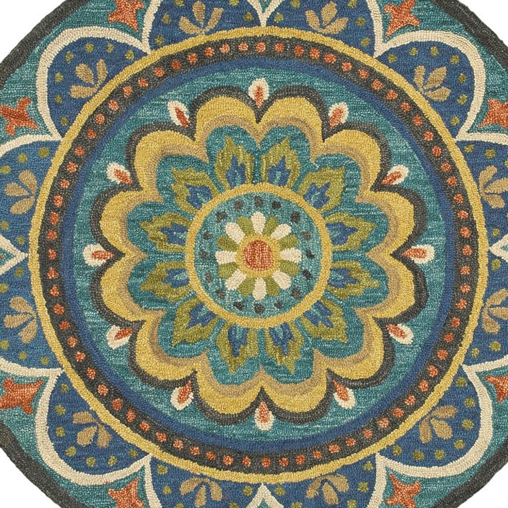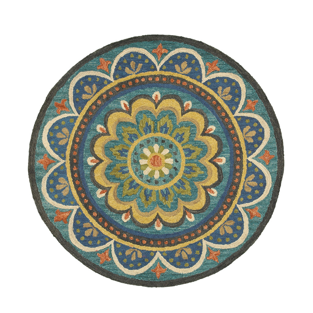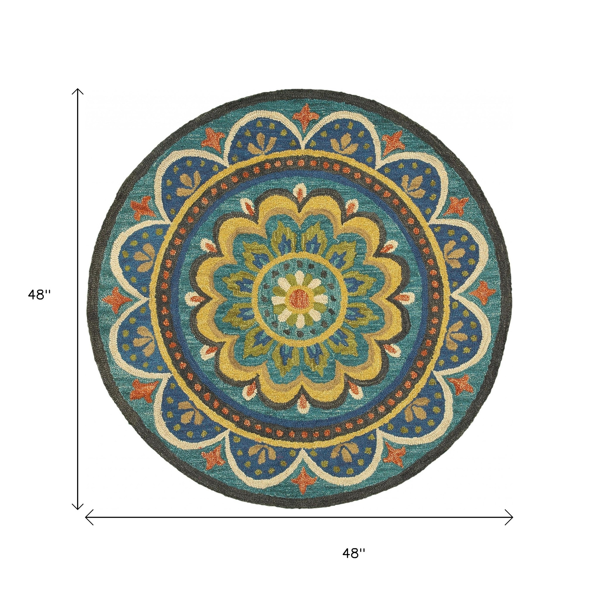Add some artistry to your room with this 4-foot blue and orange round wool floral medallion hand tufted area rug. Multiple colors including blue, orange, and yellow create a beautiful floral design. Standing the test of fashion and function, this rug is hand-tufted with 100% virgin wool to ensure durability and considerable insulating property. The smooth and low pile construction offers a velvety surface texture making it easy to clean while being an excellent option for high-traffic areas. If you want a playful but practical rug, this colorful wool round is for you. 48-inch H x 48-inch W x 0.5-inch D