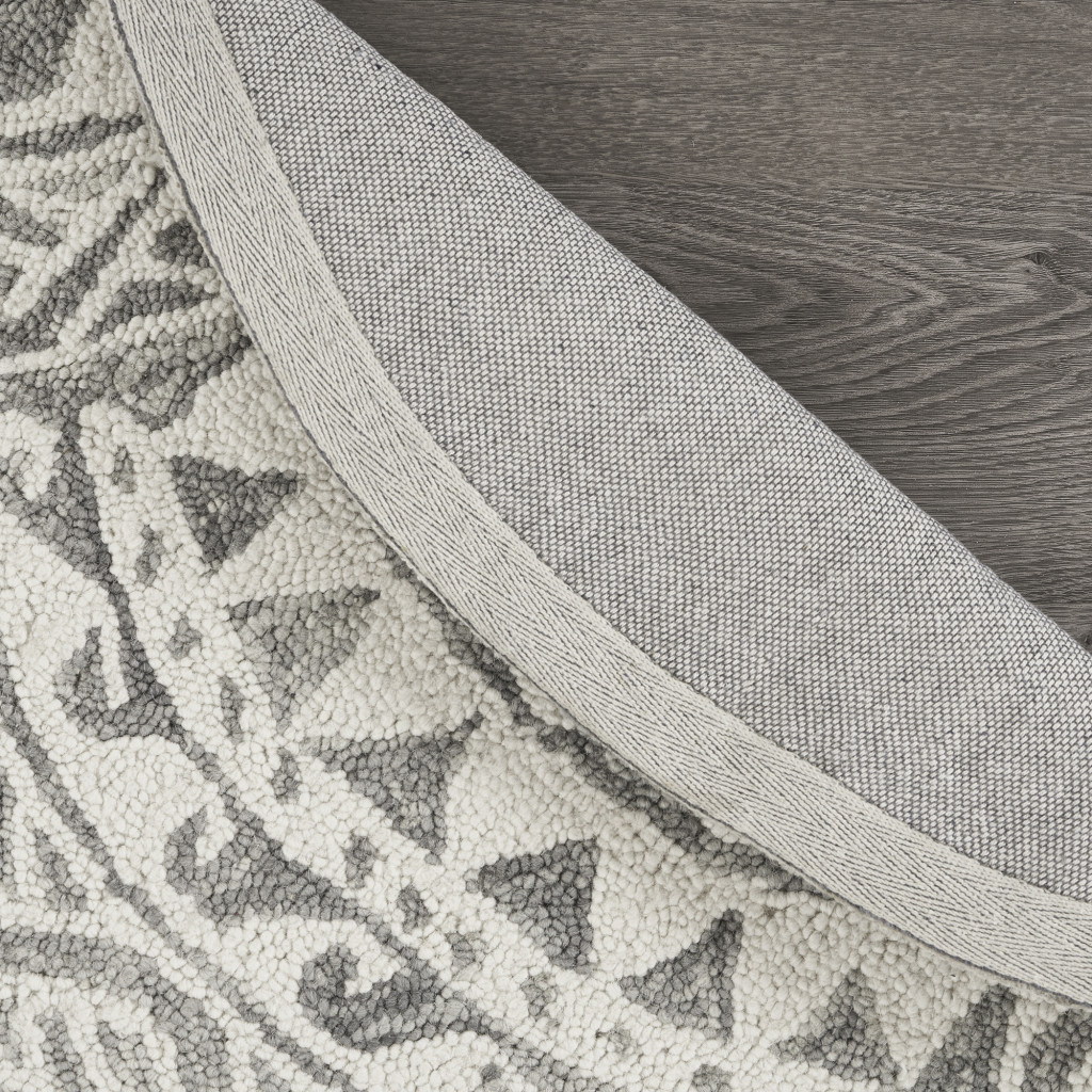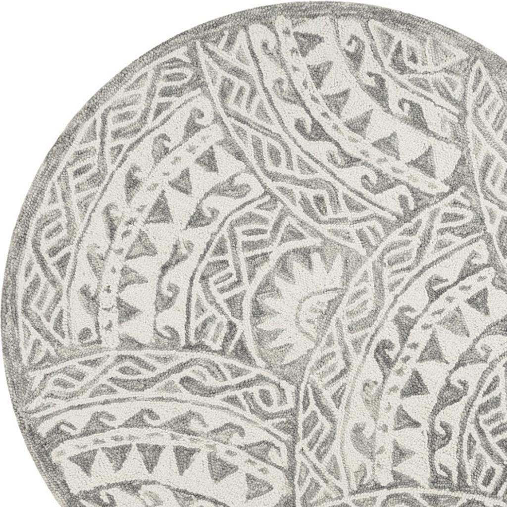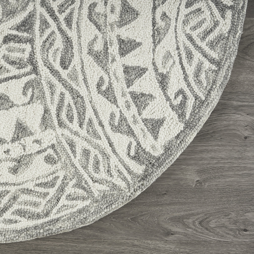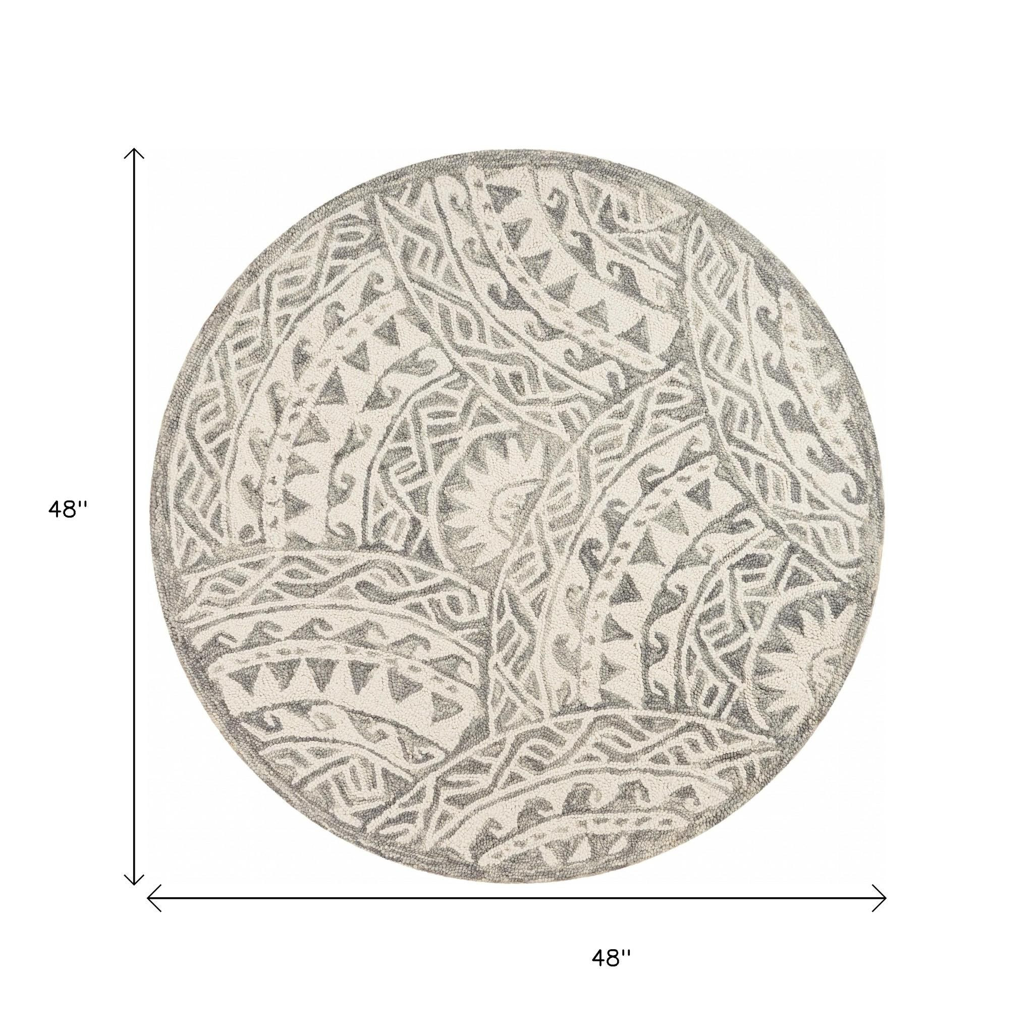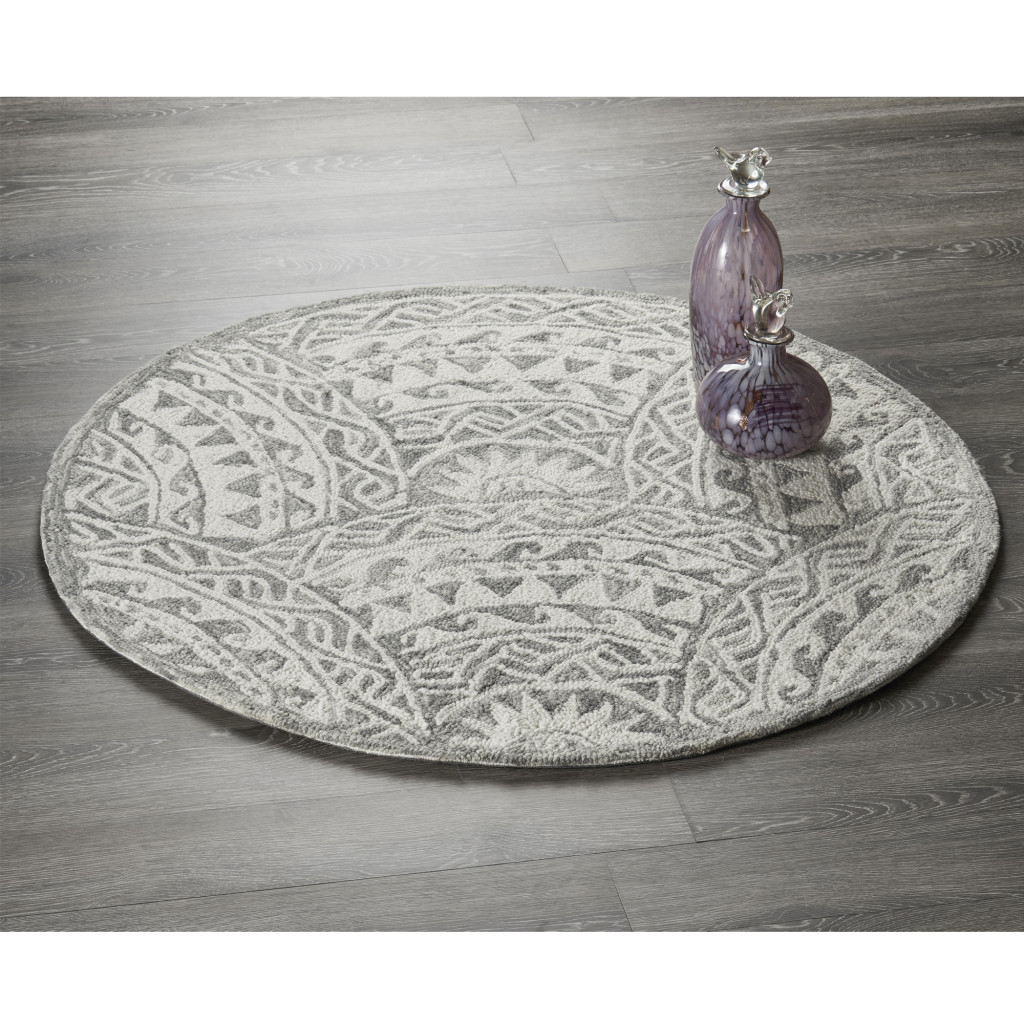 Transform the look of your contemporary living space with this Round Gray Decorative Waves Area Rug that features a sophisticated color palette to stay in line with modern styling. The intricately decorative gray geometrics resembles the crashing waves of the sea to blend in amidst a range of interior themes. Hand-tufted with 100% virgin wool that is known fur its strength and durability to last long and the insulation property helps regulate temperature. The ow pile adds to the smooth and sumptuous surface texture for a comfortable underfoot. Upholding neutral hues with traditional embellishments, this area rug will add a sense of class and comfort to your place without being too loud. 48”