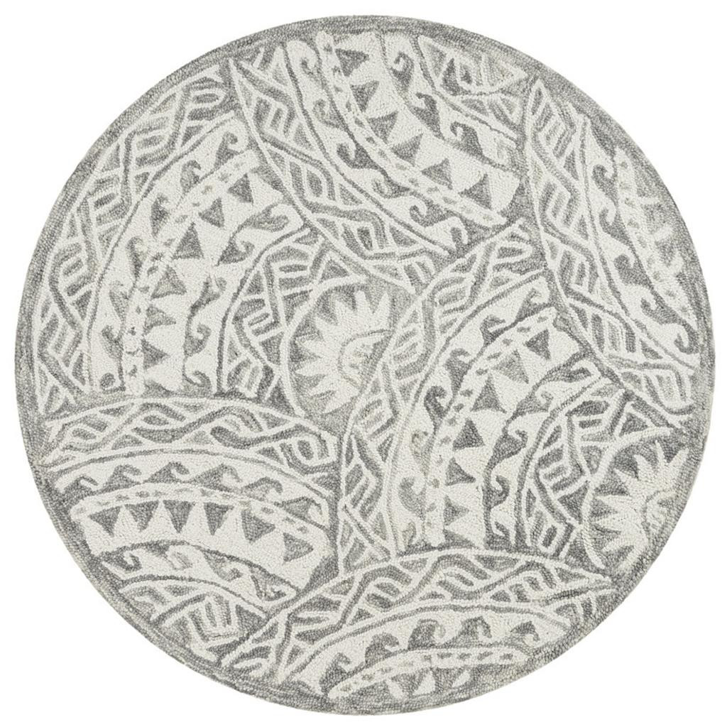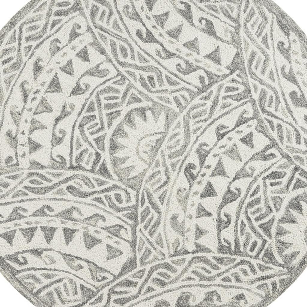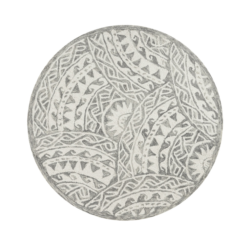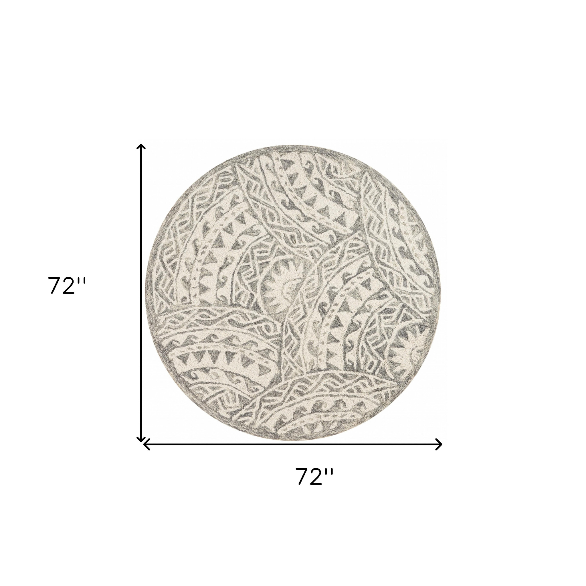 Add some artistry to your room with this 6' gray round wool geometric hand tufted area rug. This geometric round shaped rug features a geometric pattern in gray that combines a good looking print with a unique and updated shape. The mix of shape, color, and design gives this rug refreshing visual interest. Place this area rug against a hardwood or tile floor and it will enliven your living space with style and sophistication. 0.5" H x 72" W x 72" D