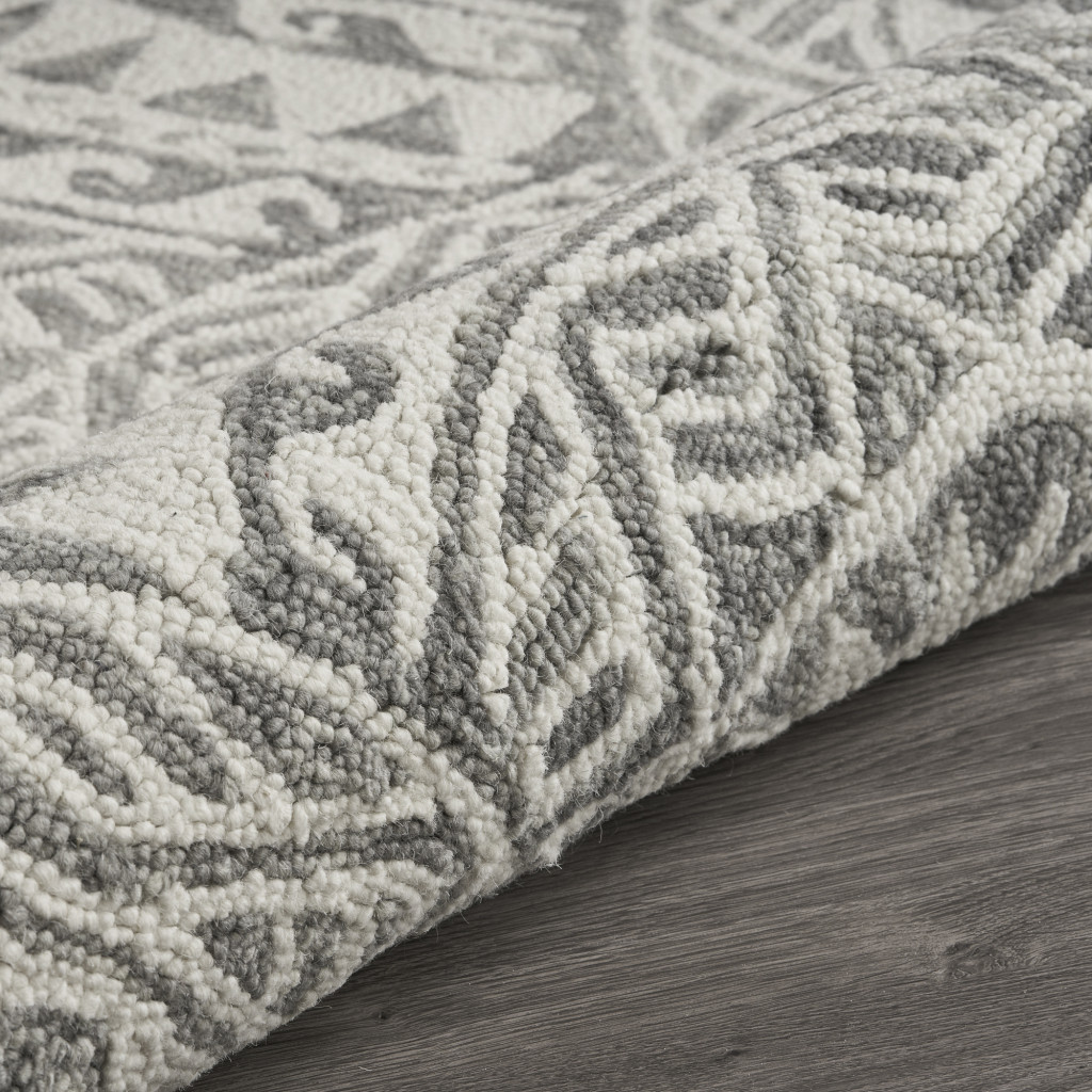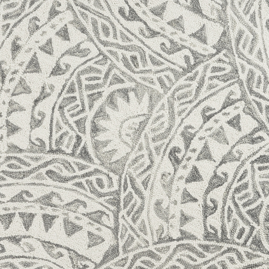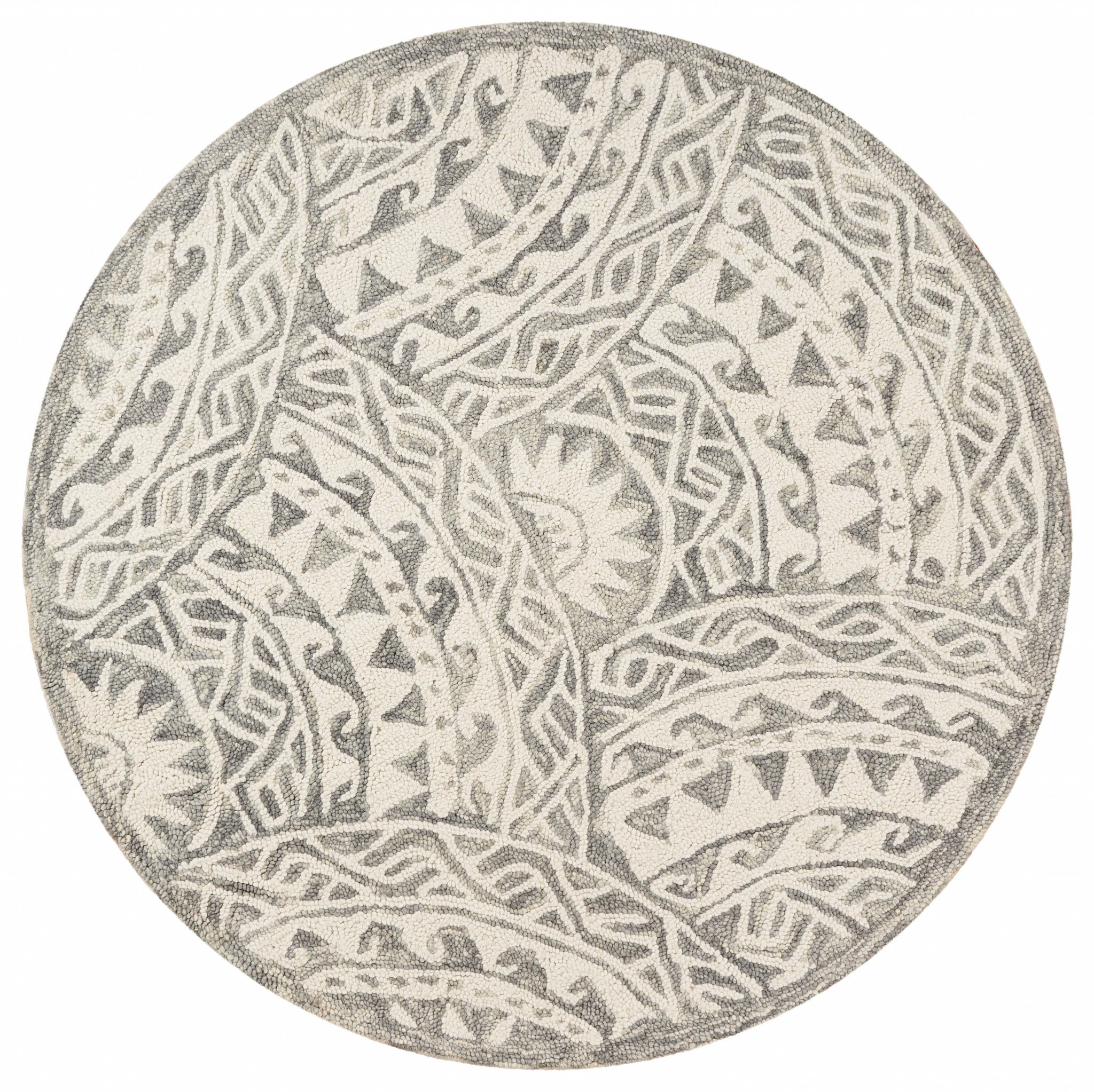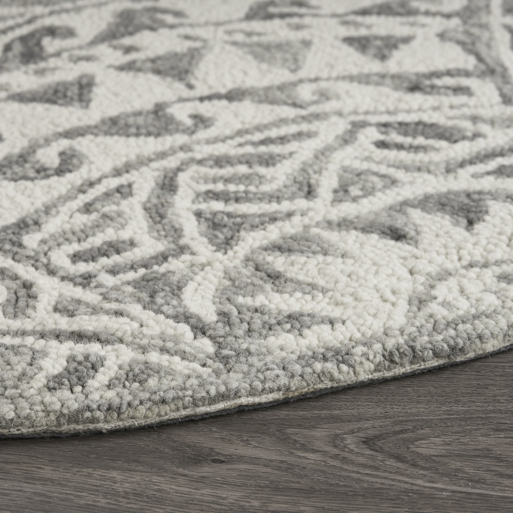 Add some artistry to your room with this 6' gray round wool geometric hand tufted area rug. This geometric round shaped rug features a geometric pattern in gray that combines a good looking print with a unique and updated shape. The mix of shape, color, and design gives this rug refreshing visual interest. Place this area rug against a hardwood or tile floor and it will enliven your living space with style and sophistication. 0.5" H x 72" W x 72" D
