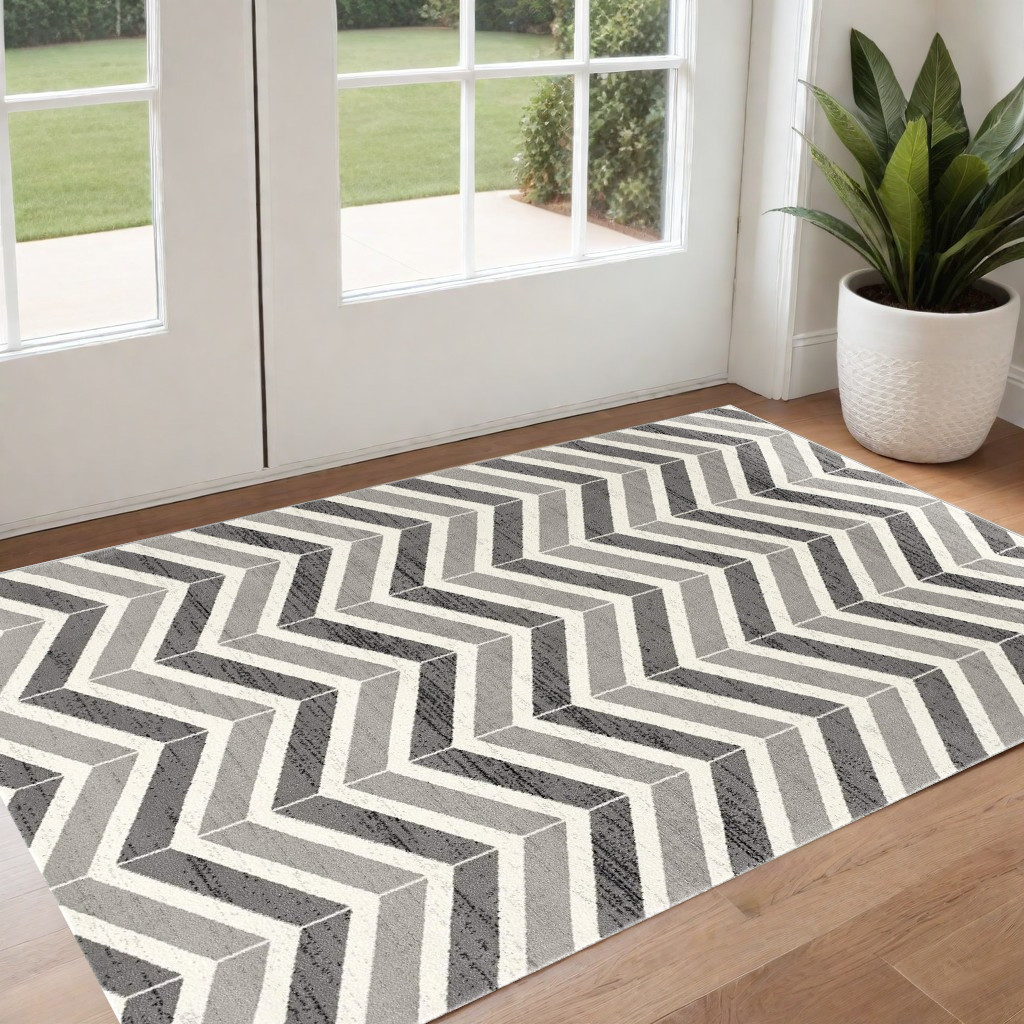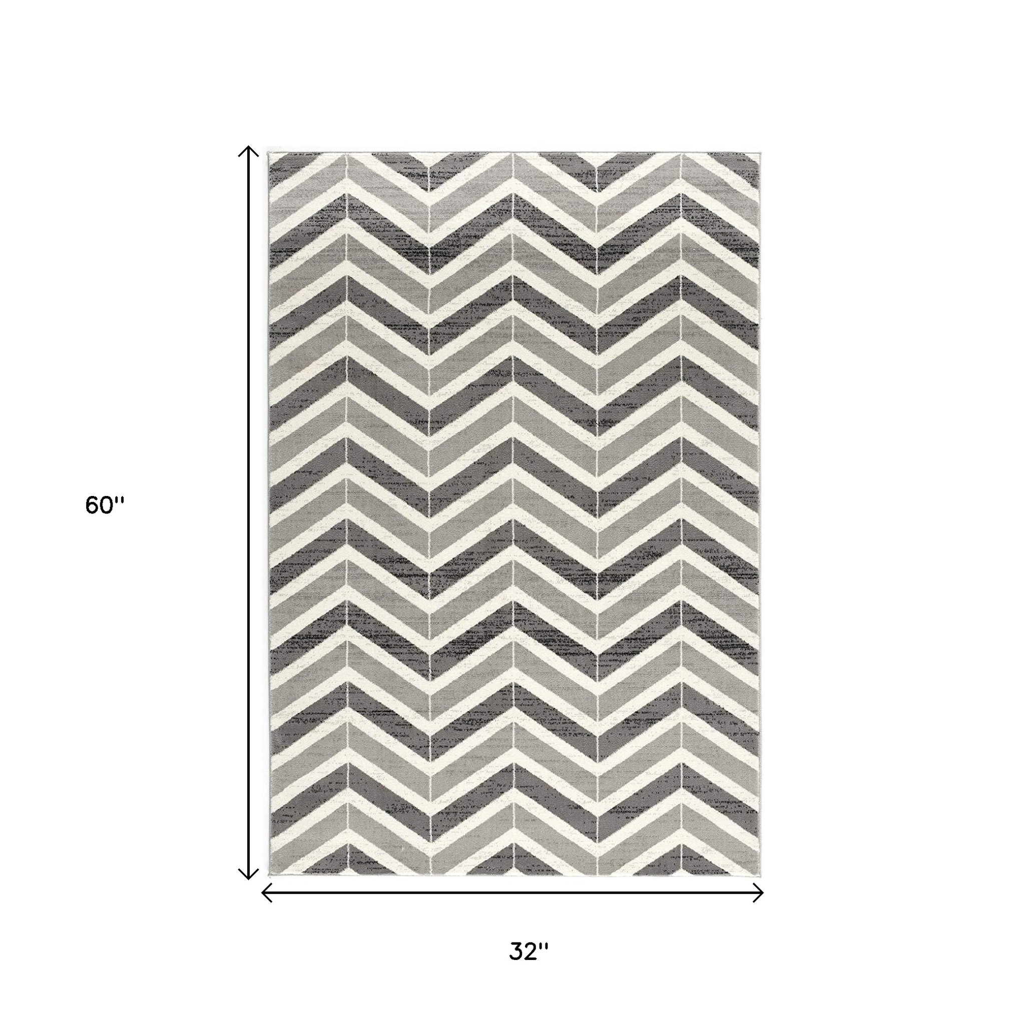 This 3-foot x 5-foot gray and ivory chevron distressed area rug, is a great way to add warmth to a room. Ideal for spaces with kids and pets, this rug is stain resistant to help repel dirt and spilled liquids. Built to last, this rug crafted from olefin fibers is known for its durability and long lasting appeal. Rugs are a great way to showcase your style, hide imperfections, warm your home and reduce noise. This smaller sized, modern styled rug is just what you need for your walkway, bedside, in front of door, cabinet, refrigerator, or chair. 32-inch h x 60-inch w x 0.8-inch d.