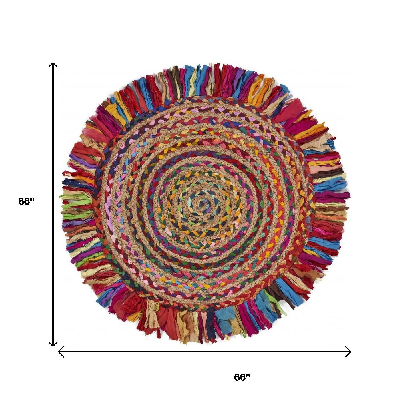 Add great coloration and comfortable texture to your space with this 6-foot rainbow abstract geometric hand woven round rug. Crafted by skilled artisans, this hand woven rug is genuine and unique. No two will be exactly alike. Rugs are a great way to showcase your style, hide imperfections, warm your home and reduce noise. This larger sized, transitional styled rug is ready to create a focal point or statement piece in your room. 66.00-inch h x 66.00-inch w x 0.50-inch d.