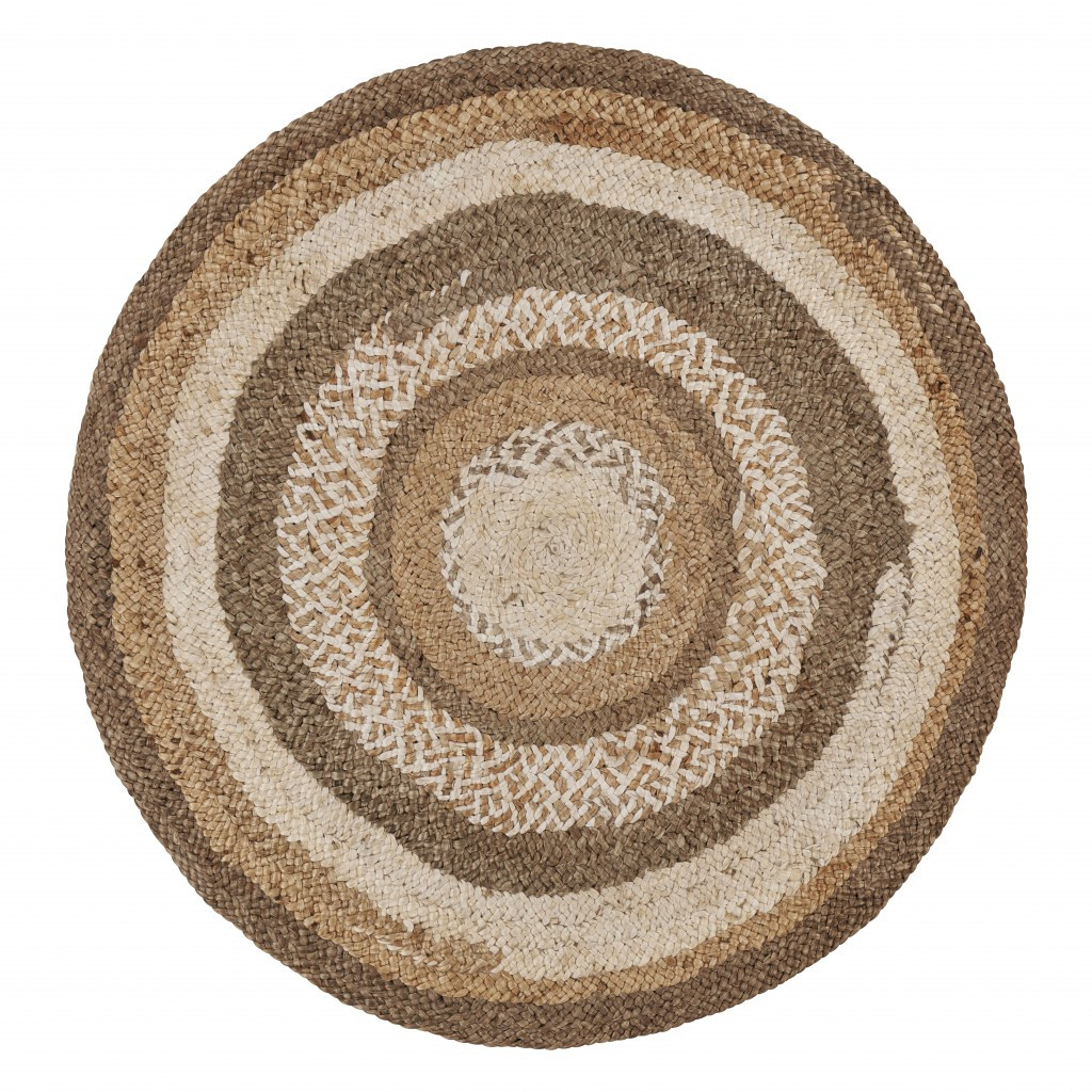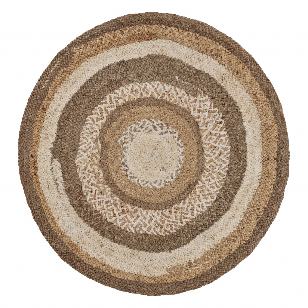 Add some artistry to your room with this 5-foot beige jute abstract geometric hand braided round rug. Crafted from jute fibers that give this piece premium texture, refinement, and appeal. Rugs are a great way to showcase your style, hide imperfections, warm your home and reduce noise. This smaller sized, transitional styled rug is just what you need for your walkway, bedside, in front of door, cabinet, refrigerator, or chair. 48.00-inch h x 48.00-inch w x 0.50-inch d.