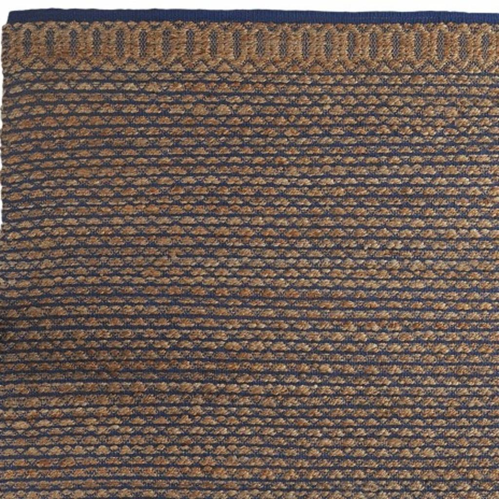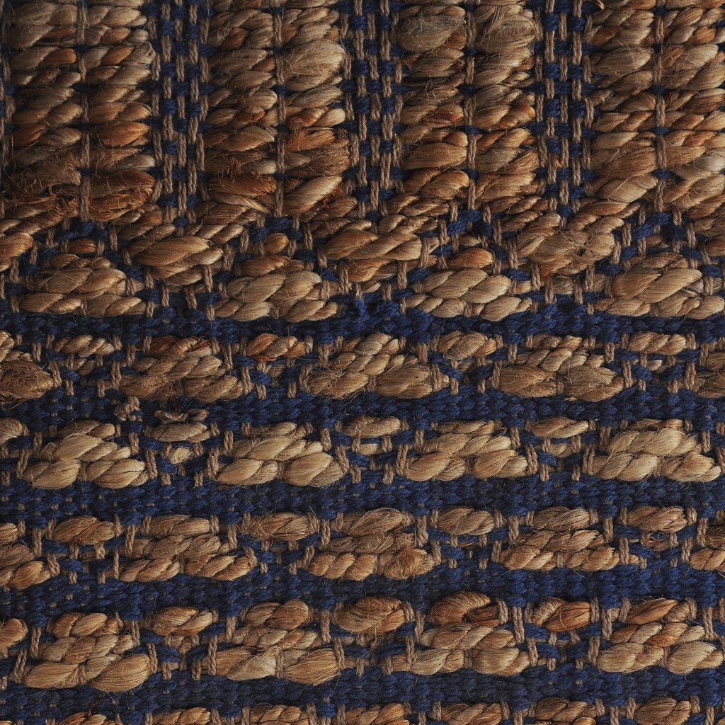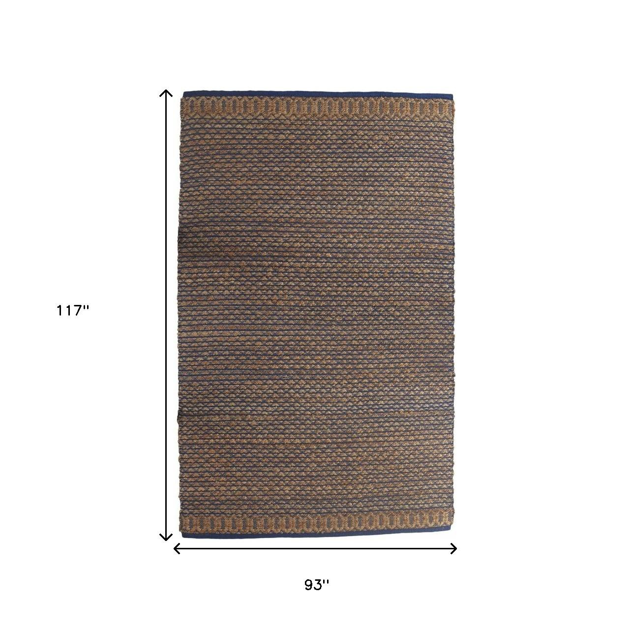 The classic tone and texture of this Tan and Blue Detailed Lattice Area Rug will instantly make your space look and feel more inviting with an earthy essence. The finely detailed navy blue lattice over a tan background gives the piece a rich bohemian vibe, while the decorative edges complete the look. The fusion of jute and cotton in the making increases the durability of this piece against wear and tear while being water-resistant and easy to clean. This rug is constructed in a low pile for a smooth and neat surface texture, allowing it to be an excellent solution for high-traffic areas indoors. The bold color palette of this area rug will complement a wide variety of interior styles without being too loud. 93” x 117” x 0.4”
