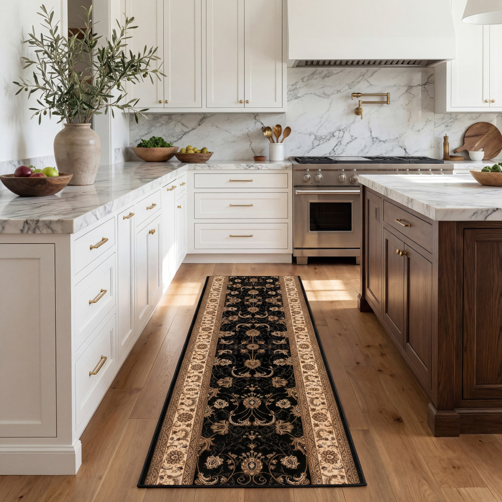 Add great coloration and comfortable texture to your space with this 13-foot black and ivory oriental runner rug. Built to last, this rug crafted from olefin fibers is known for its durability and long lasting appeal. Rugs are a great way to showcase your style, hide imperfections, warm your home and reduce noise. This rectangular shaped rug features a abstract design that will add a functional and decorative accent to your space. This transitional style runner makes a great accent for the hallway, in front of cabinets, in the laundry room, or any other space you need a narrow and long rug. 27-inch h x 156-inch w x 0.6-inch d.