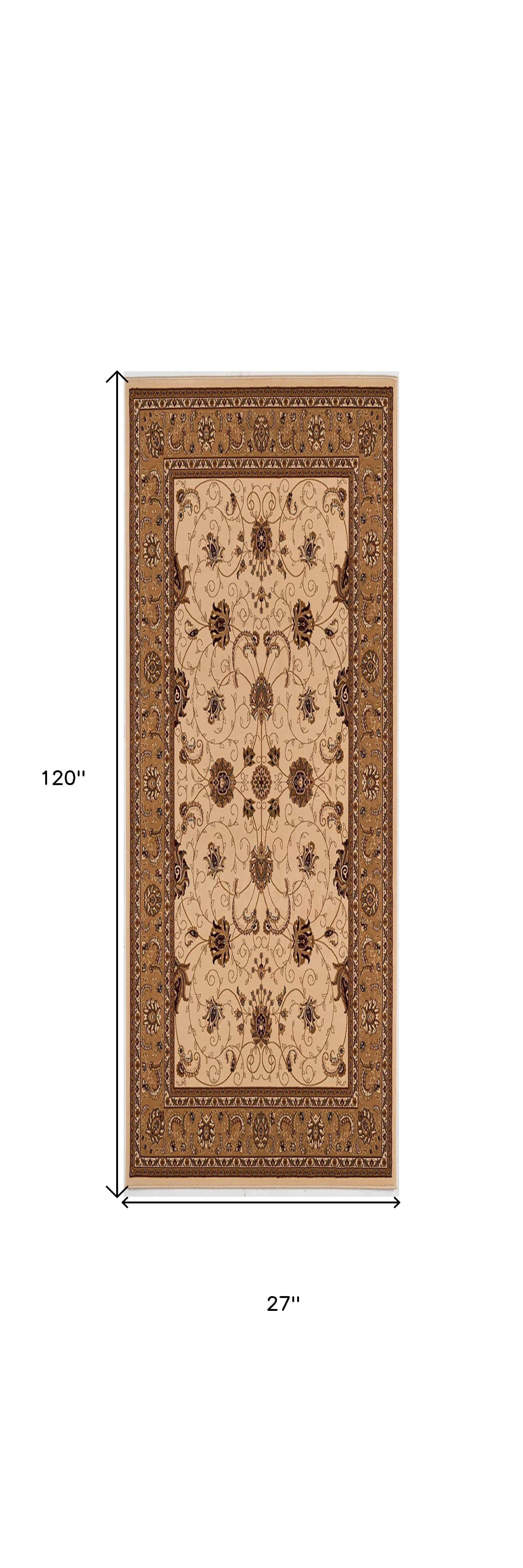 Set an inviting tone in your space with this 10-foot beige and ivory oriental runner rug. Built to last, this rug crafted from olefin fibers is known for its durability and long lasting appeal. Rugs are a great way to showcase your style, hide imperfections, warm your home and reduce noise. This rectangular shaped rug features a abstract design that will add a functional and decorative accent to your space. This transitional style runner makes a great accent for the hallway, in front of cabinets, in the laundry room, or any other space you need a narrow and long rug. 27-inch h x 120-inch w x 0.6-inch d.