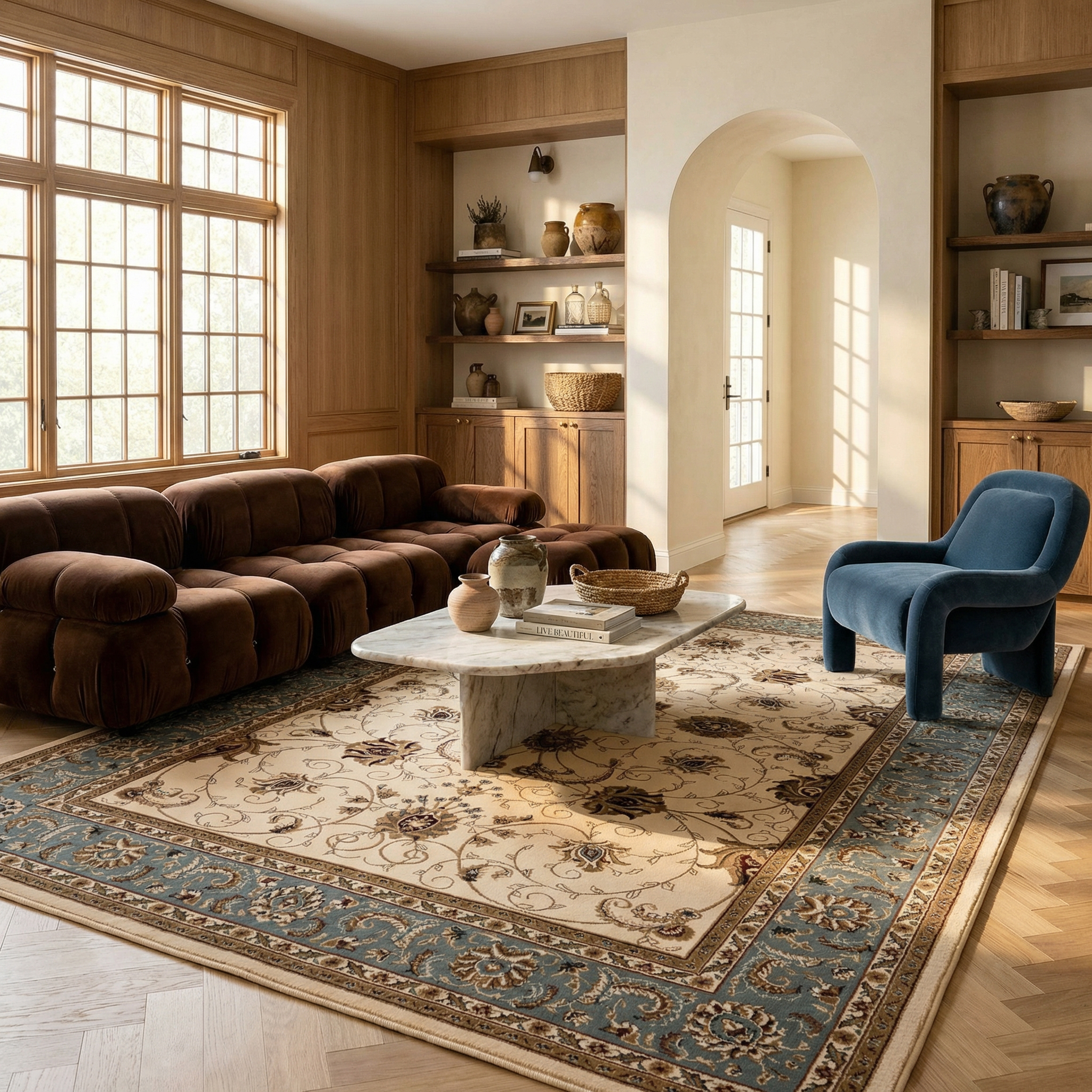 Set an inviting tone in your space with this 7-foot x 9-foot blue and ivory oriental area rug. Built to last, this rug crafted from olefin fibers is known for its durability and long lasting appeal. Rugs are a great way to showcase your style, hide imperfections, warm your home and reduce noise. This larger sized, transitional styled rug is ready to create a focal point or statement piece in your room. 78-inch h x 112-inch w x 0.6-inch d.