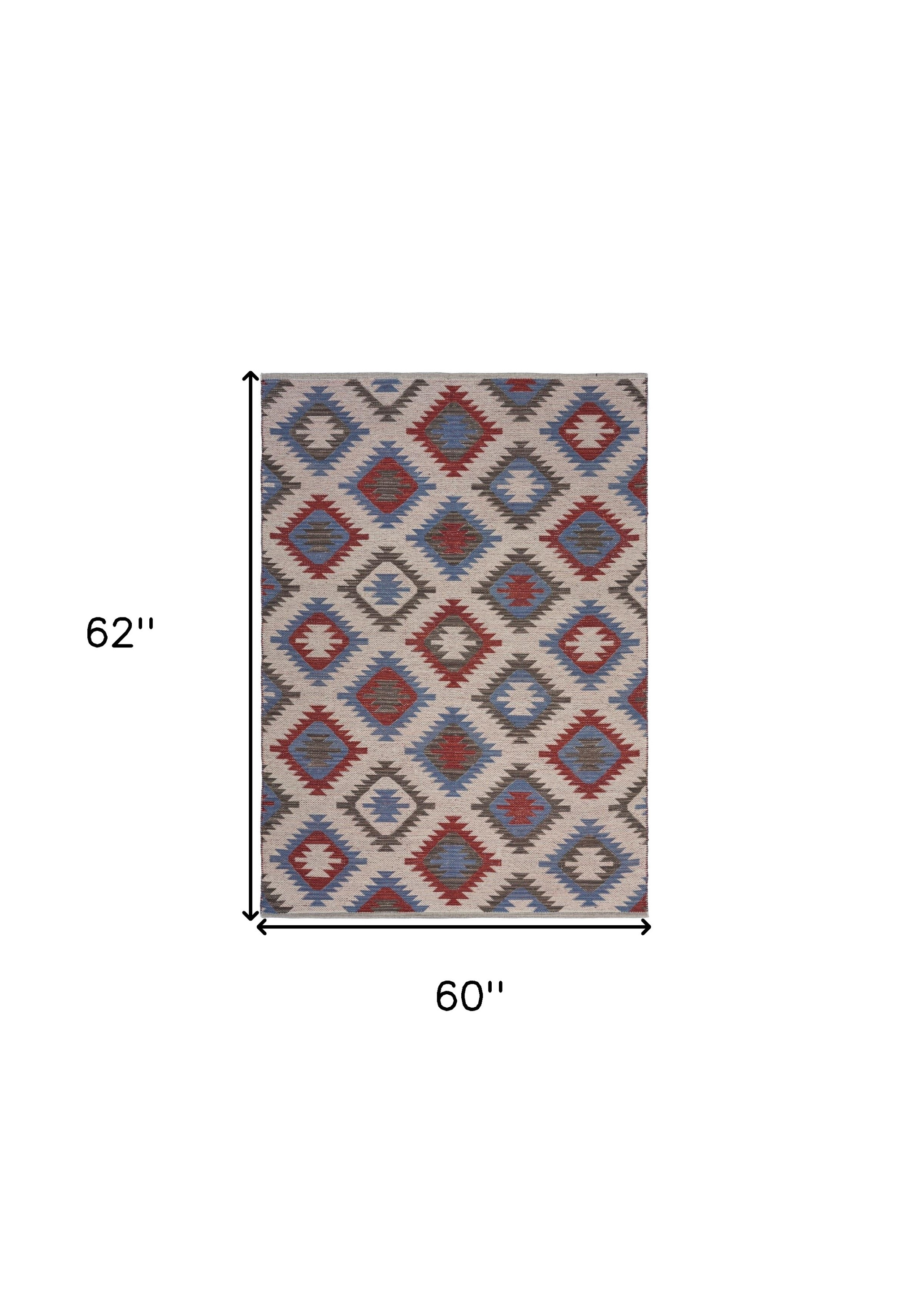 Add some artistry to your room with this 5-foot x 7-foot red and blue geometric diamonds area rug. This larger sized rectangle rug crafted in a traditional style using a handmade flatweave technique is perfect for your living room. Made of cotton, the blue and red hues will infuse warmth and vibrancy into your space, creating a stunning focal point that exudes elegance and charm. 60-inch h x 62-inch w x 0.3-inch d