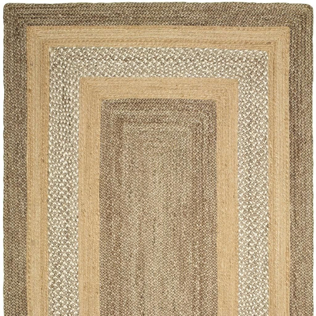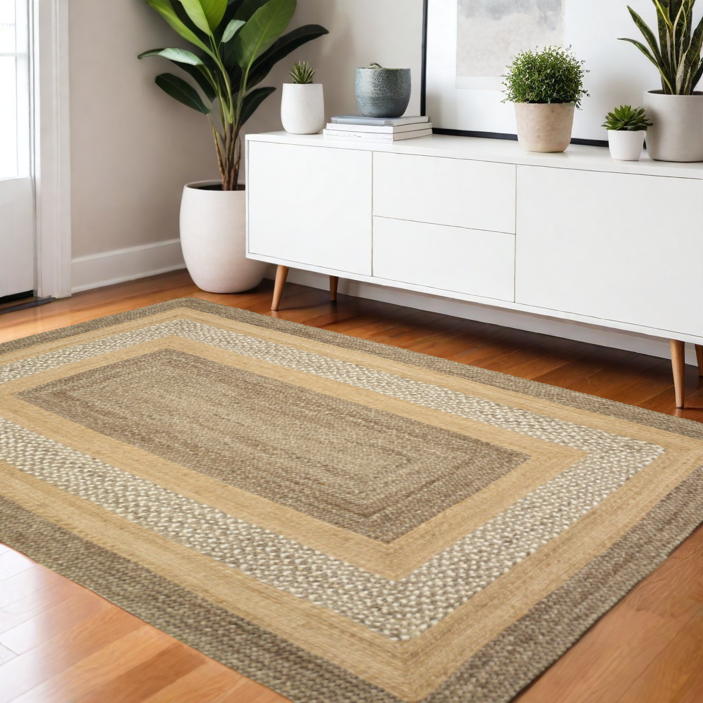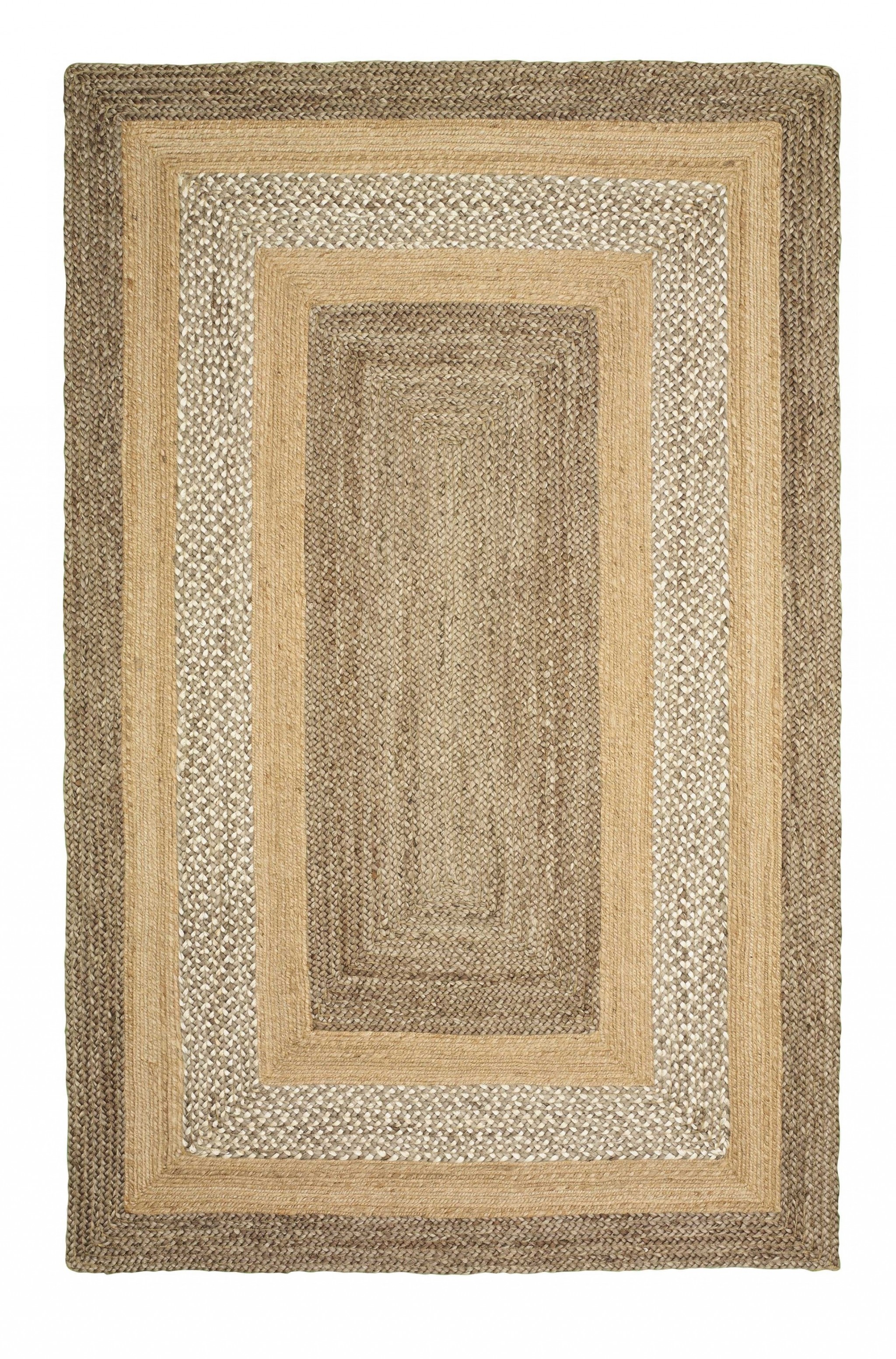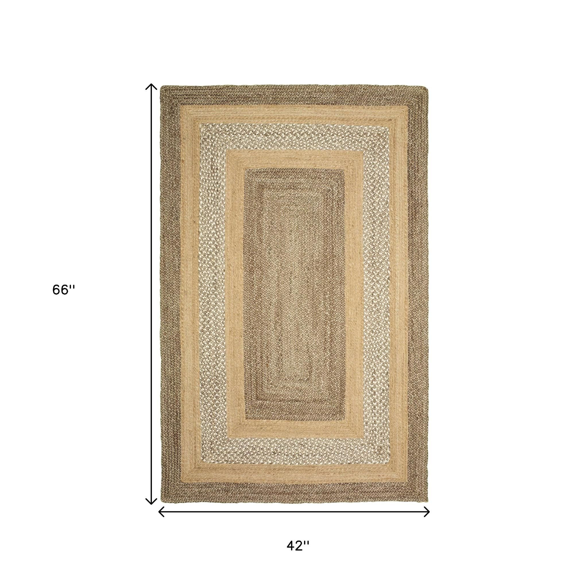 Draw the attention of the guests with this stunning Tan and Beige Bordered Area Rug that exhibits a neutral color palette in an attractive design pattern. Flaunting the geometrics of multiple borders in shades of tan and beige to create visual intrigue with a traditional vibe. Hand braided with 100% jute fibers which are naturally soft and durable to last long and prevent dirt from building up. The thick but soft weave adds to the surface texture for a comfortable and cushiony underfoot, making it a great accent for busy households. Set an inviting and cozy tone into your place with this classy area rug that will never go out of style. 42” x 66” x 0.4”