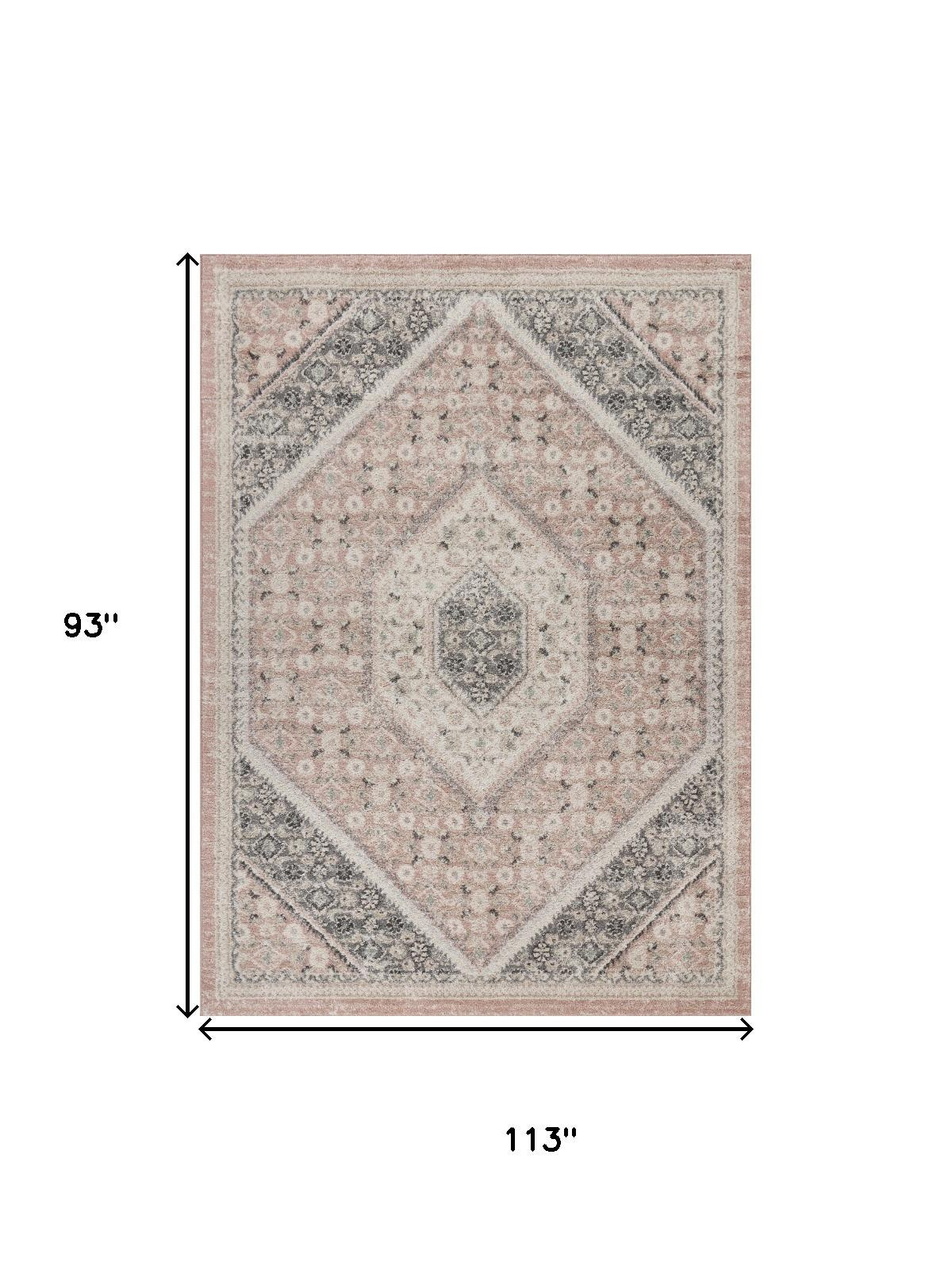 Integrate an aura of boho-chic styling into your living space with this Gray and Soft Pink Traditional Area Rug that upholds on-trend hues in traditional patterns. The intricate details of the gray and blush pink floral motifs are composed into an oriental geometric outline to accentuate trend and tradition in a compact design while the defined border perfects the look. Made in Turkey with 100% polypropylene, this rug is very durable to stand against outdoor elements while being stain-resistant and easy to clean. The low-pile construction adds to its surface texture for a smooth and luxurious feel in areas with heavy foot traffic. Combining a soothing palette in a traditional charm, this area rug will fill your living space with ease and elegance. 93” x 113” x 0.36”