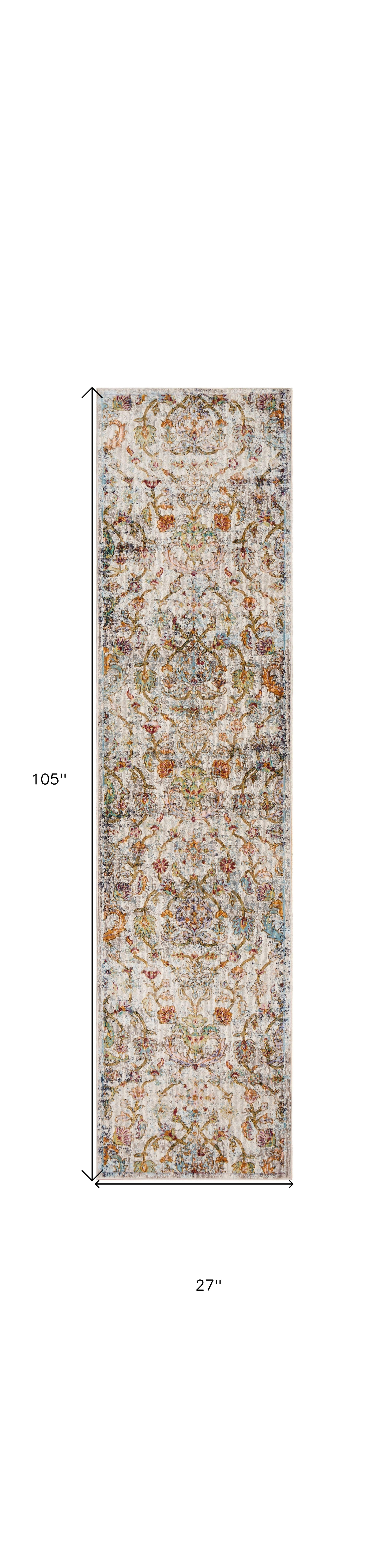 Conveying a sense of defined luxury, this Beige Abstract Garden Runner Rug will induce a classic personality to your living space. The intricate detailing of the vibrant floral vines over a distressed beige-toned surface gives this piece a traditional and timeworn appeal. Machine-made with durable polypropylene to withstand wear and tear of high-traffic areas while resisting stains. Easy to clean and maintain, the low pile gives it a refined look with a smooth texture to experience a velvety feel every time you step on it. The neutral color scheme with pops of vivid hues makes this runner rug an impressive accent to coordinate with both warm and cool-toned decors. 27” x 105” x 0.4”