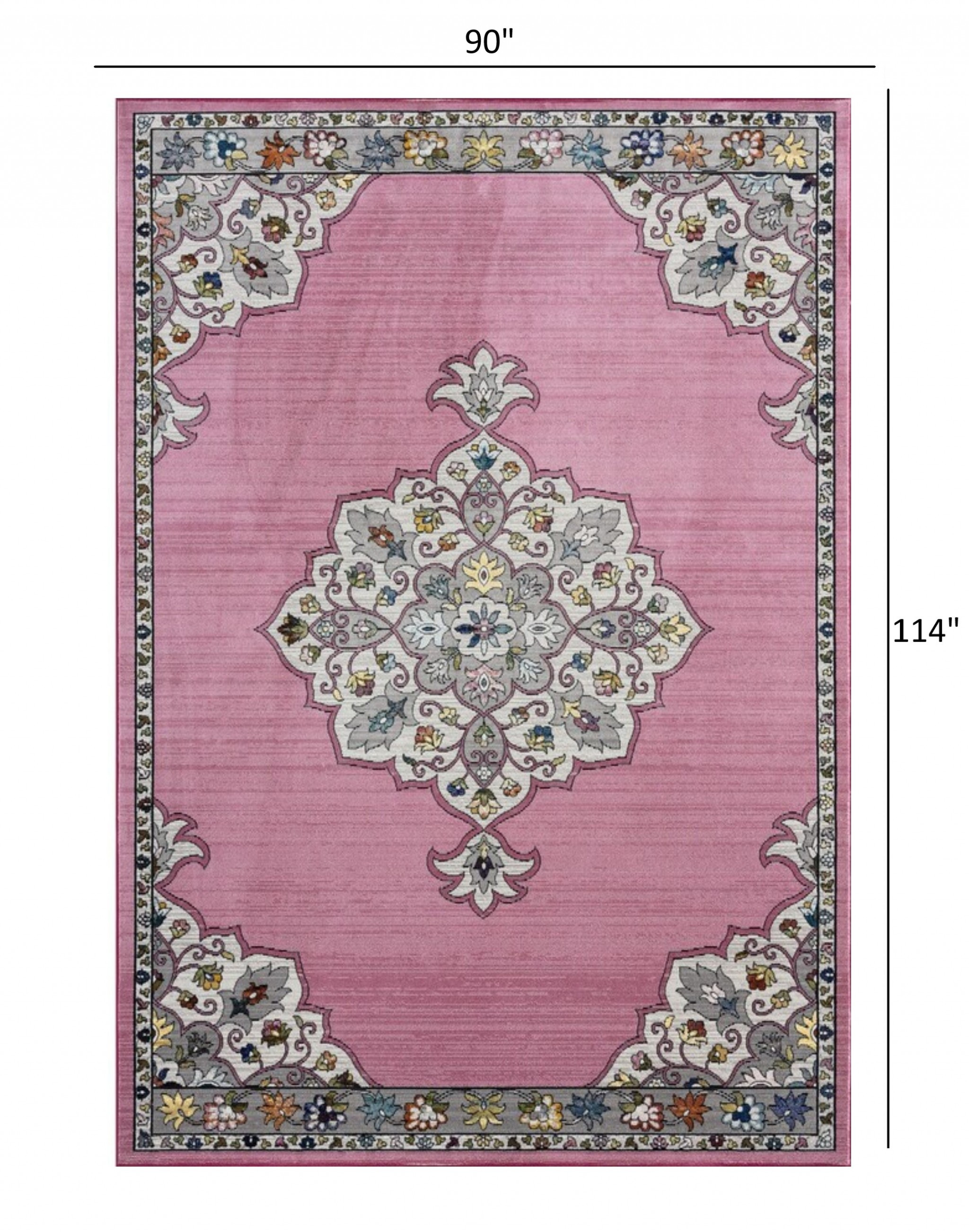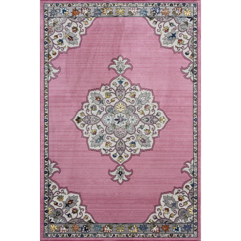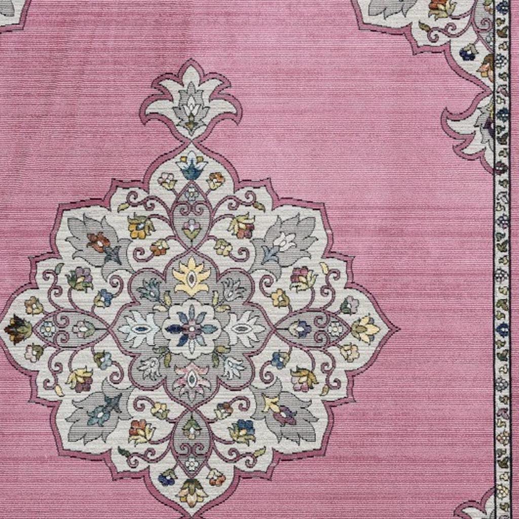 Exuding the aesthetics of royal luxury with a hint of playful hues, this Pink Traditional Medallion Area Rug will complement any traditional, transitional, or bohemian ensemble. The detailing of the decorative border and a prominent medallion in the center looks captivating on the onion pink base. Machine-made in Turkey with 100% polypropylene that is not only inherently stain-resistant and durable but also easy to clean and maintain, making it an ideal accent for living room, dining area, or office space. Easy on the eyes with a comforting feel under the feet, this rug is constructed in a low pile that adds to the surface texture and stays in style. The timeless floral motifs and on-trend shades of this area rug will spruce up your living space without being too loud. 90” x 114” x 0.4”