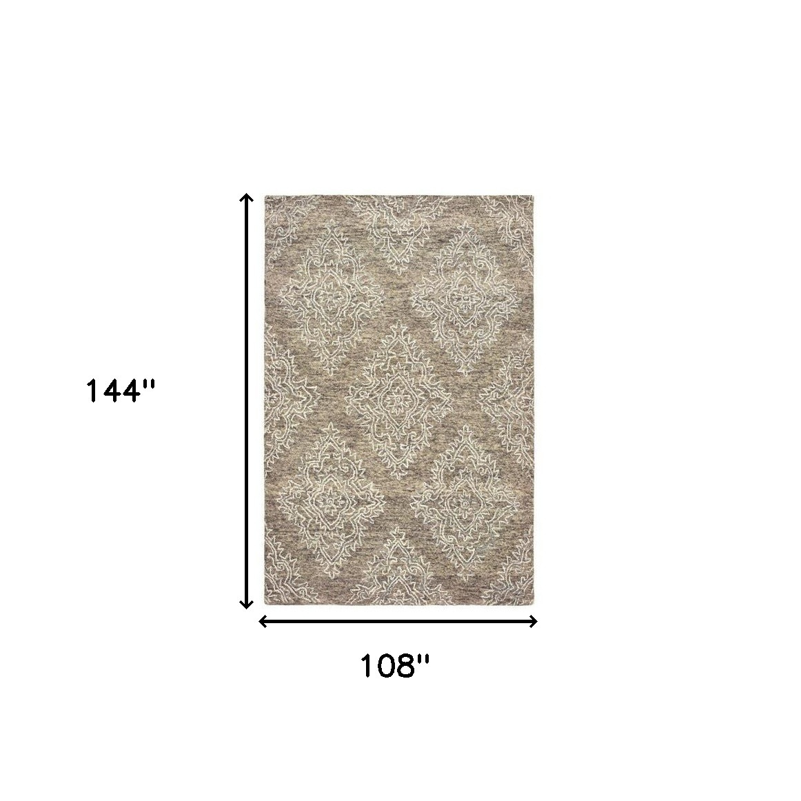Taking traditional designs into modern styling, this Khaki and White Damask Area Rug uphold the best of both worlds, making it an excellent accent for any transitional ensemble. The rhythmic patterns with intricate floral elements in white are fashioned into a lattice over a khaki backdrop to captivate the eyes. Made with 100% wool, this rug is soft yet durable enough to last long and hold its color for long. The soft pile adds to the surface texture for a soft and sumptuous underfoot, making it a luxurious accent on the floor. Transform the looks of your living room with this stunning area rug that features a subtle color palette with a traditional tone. 108” x 144” x 0.4”