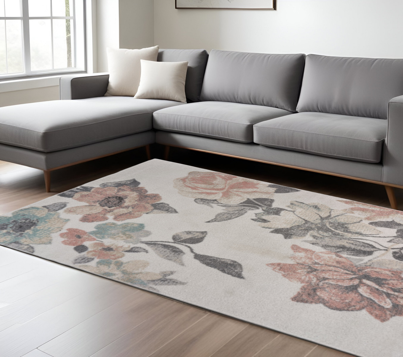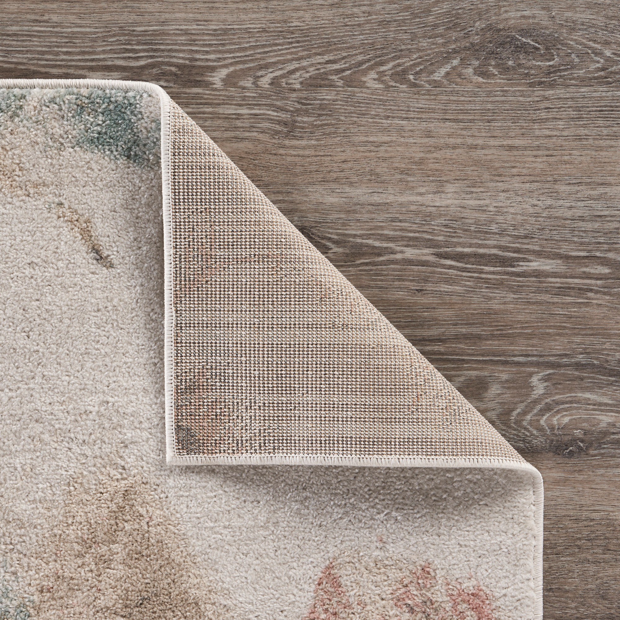 With a beautiful blend of soft shades and lovely floral patterns, this Ivory Soft Floral Artwork Area Rug will add grace and beauty to your modern interior. Resembling a distressed watercolor painting of a bunch of flowers in blush pink, teal, and beige over an ivory base to create visual harmony. This rug is made in Turkey with 100% polypropylene to withstand heavy traffic with low maintenance while resisting stains and spillage. Made to stay put on the floors and stand up to the elements of a busy household while ensuring a soft and smooth underfoot due to its low pile construction. Express your love for floral prints and a neutral palette with this pleasing area rug rolled on the floor. 93” x 113” x 0.36”