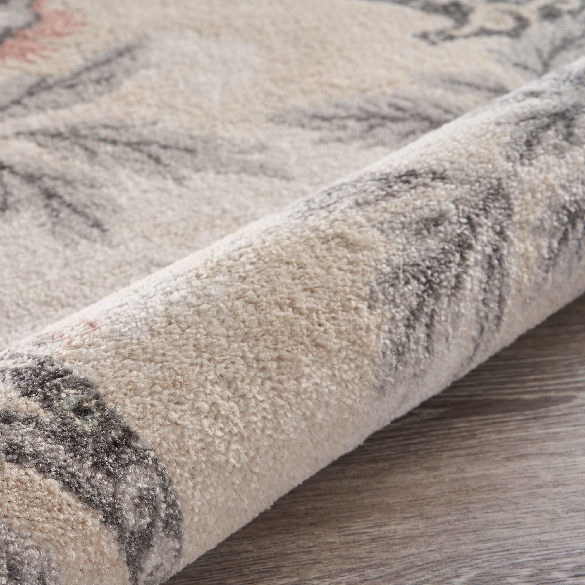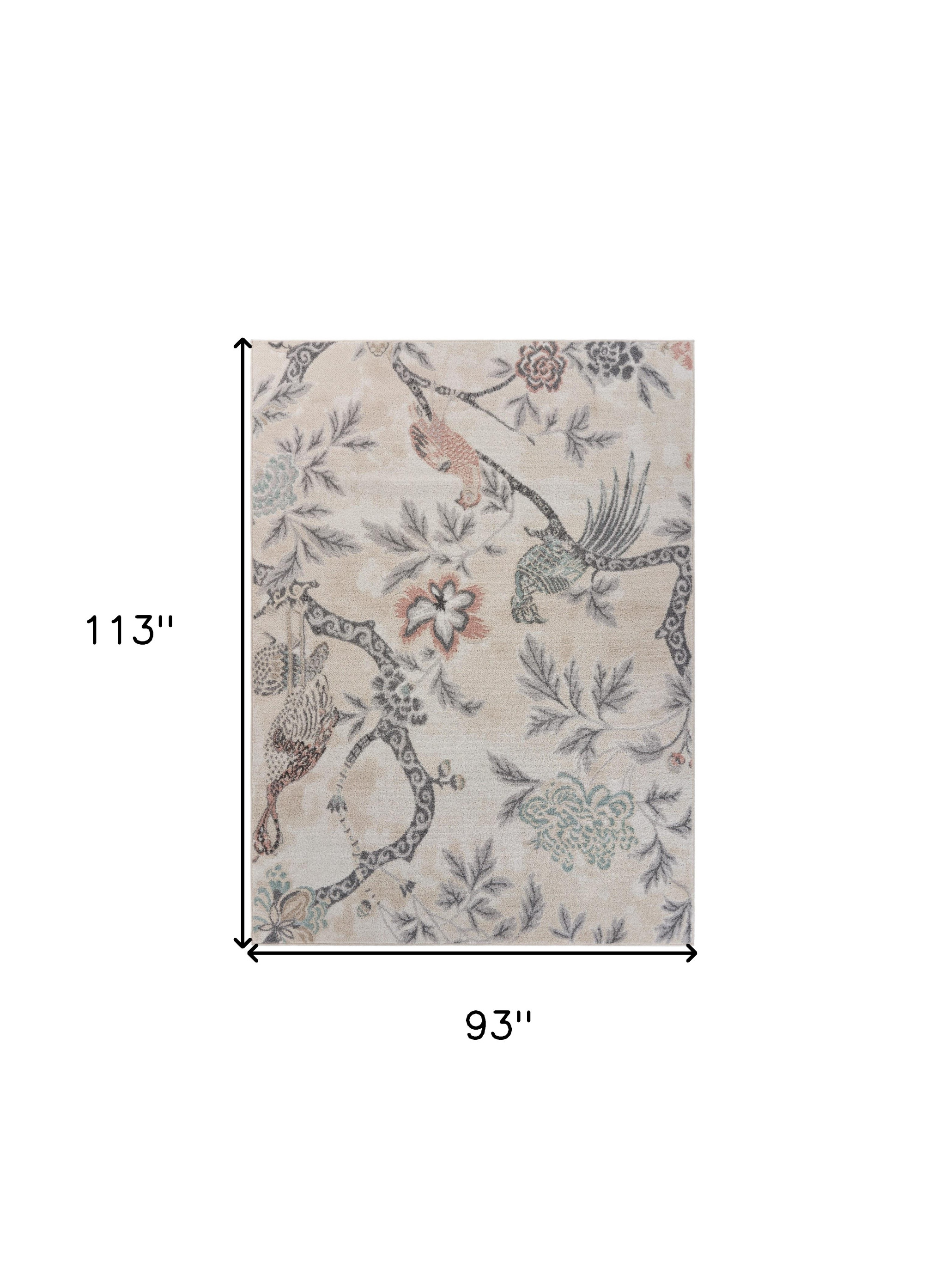Give your living space a tropical update with this Soft Beige Birds and Trees Area Rug that exhibits subtle shades with traditional nature-inspired patterns. The delicacy of the blush pink and sage detailing the trees and birds over a soft-beige backdrop creates a calm and relaxing ambiance. The rug is expertly machine-made in Turkey with 100% polypropylene, making it more durable and resistant to fading and staining. The low pile construction adds surface interest for a soft and smooth underfoot while ensuring easy cleaning. Neutral hues and intricate patterns of this stunning area rug is balanced perfectly to fit well with a variety of modern or traditional interior themes and decors. 93” x 113” x 0.36”
