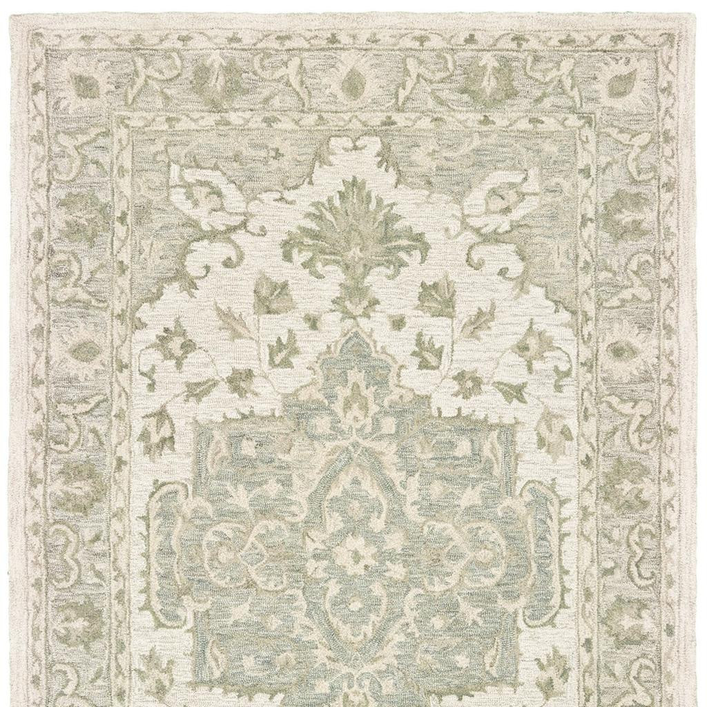 Embracing the subtle hues of the modern era with the intricate design elements of old-world luxury, this Green and Cream Medallion Area Rug exudes a timeless appeal to blend in with a variety of interior settings. The detailed decorative medallion in soft sage and beige creates a visual harmony over the cream-toned base. Made with a blend of wool and cotton for enhanced durability and strength to withstand the elements of high traffic areas indoors while being an excellent decorative accent on the floor. The plush surface texture is due to the soft medium pile construction that offers a layer of warmth and comfort under the feet, making it an excellent accent for lounging with your loved ones. Easy on the eyes with a refreshing touch, this beautifully crafted area rug is made to enhance the aesthetic of your living space. 60” x 93” x 0.5”