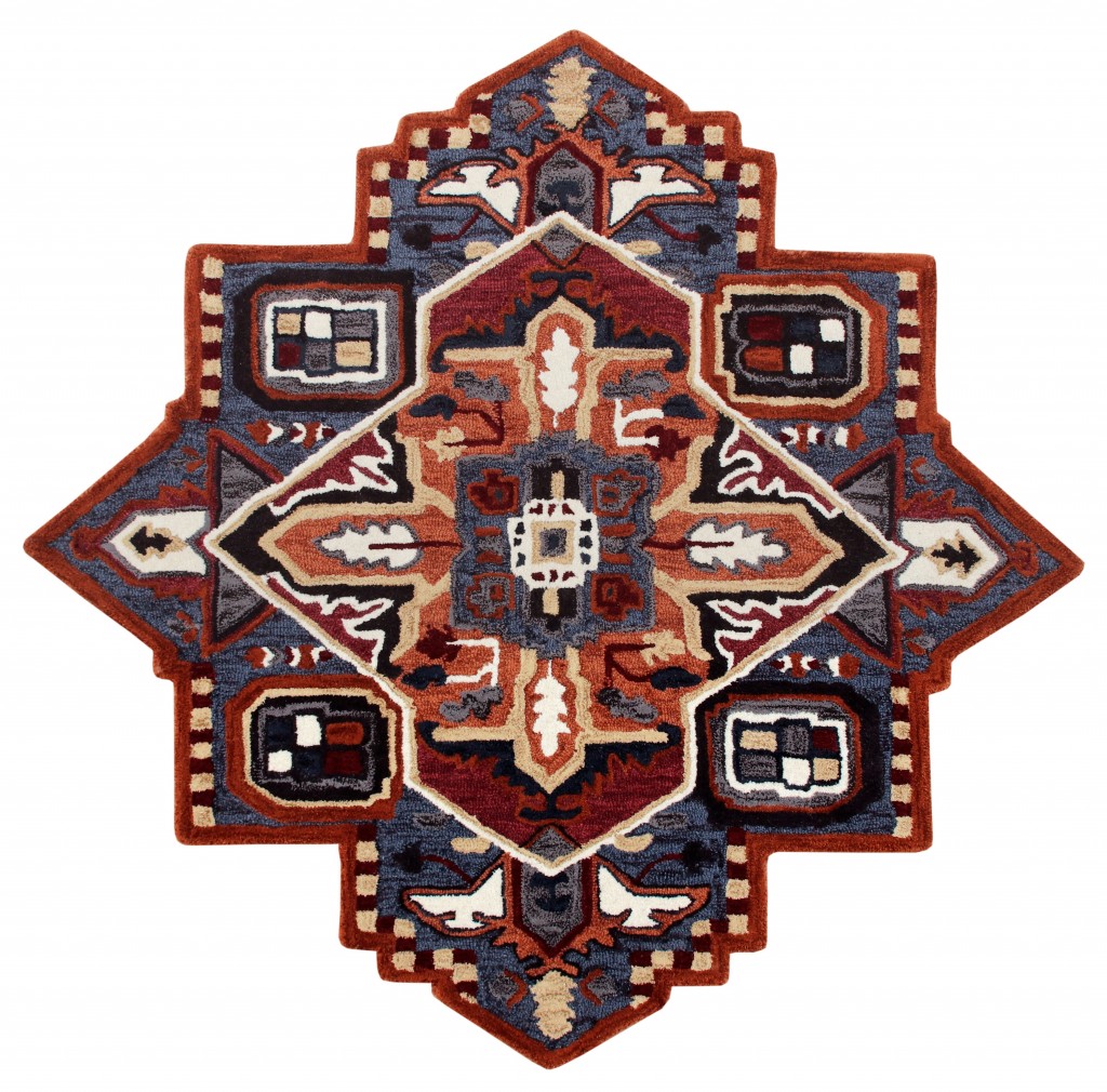 This 5-foot x 5-foot blue rust and orange wool medallion hand tufted area rug, is a great way to add warmth to a room. Crafted by skilled artisans, this hand tufted rug is genuine and unique. No two will be exactly alike. Rugs are a great way to showcase your style, hide imperfections, warm your home and reduce noise. This novelty shape rug in blue, rust, and orange features a medallion that combines a good looking print with a unique shape. The mix of shape, color, and design gives this rug refreshing visual interest. This larger sized, modern styled rug is ready to create a focal point or statement piece in your room. 60-inch h x 60-inch w x 0.5-inch d.