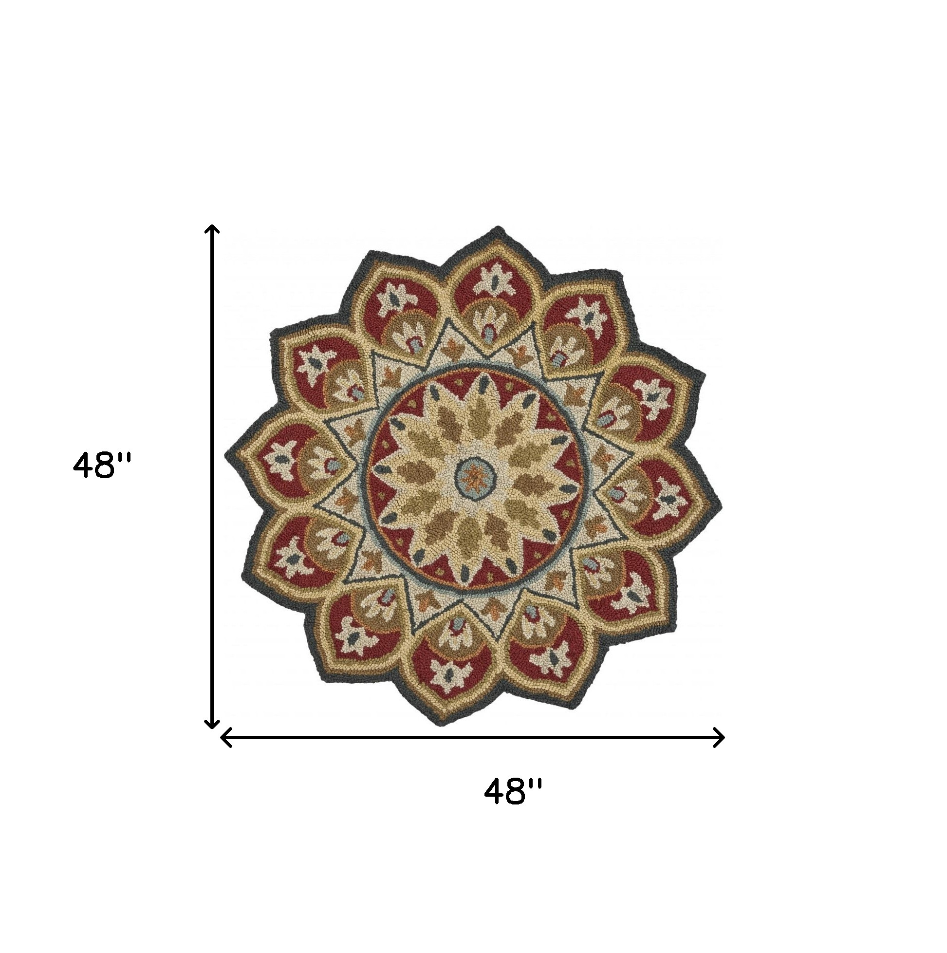 Let the authenticity of traditional styling flow through your doors with this Round Red Decorative Petaled Edge Area Rug on the floor. Highlighting a uniquely designed petaled edge with the variegated shades of brick red, beige, and black which sings well in the palette. Handcrafted with 100% wool to guarantee strength and sturdiness while being stain-resistant and easy to clean. Made to last long and stand up the elements of moderate traffic indoor areas, this rug is constructed in a medium pile that feels soft on the touch and offers a luxurious underfoot. The muted shades and old-world aesthetics of this area rug make an excellent accent for your traditional interior. 48”