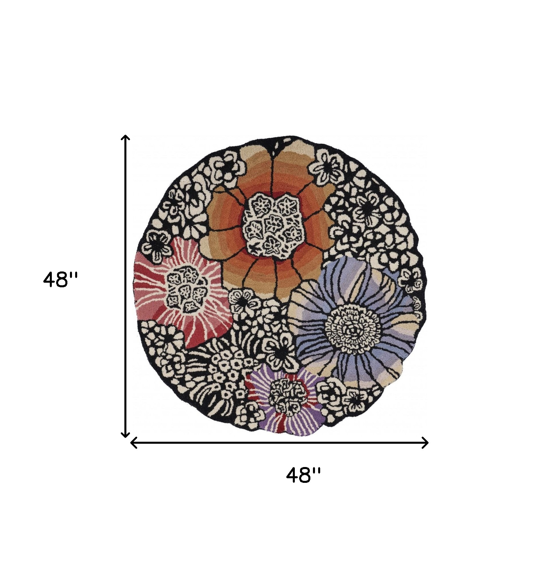 Presenting a playful artwork of floral harmony, this Round Blue and Black Floral Blossom Area Rug is made to grace any modern or casual interior. The four big flowers in the soft shades of red, orange, blue, and purple are floating on a field of monochromatic floret bed for visual interest. With a blend of wool and cotton in the making, this rug ensures a durable build and retains color and pattern for a long time. Ideal for a variety of indoor usage, this rug is constructed with a medium pile that adds to the surface texture to let you experience a soft and sumptuous underfoot. The eye-catching visuals of this area rug will add a touch of joy to your living space and make the entire place come alive in an instant. 48”