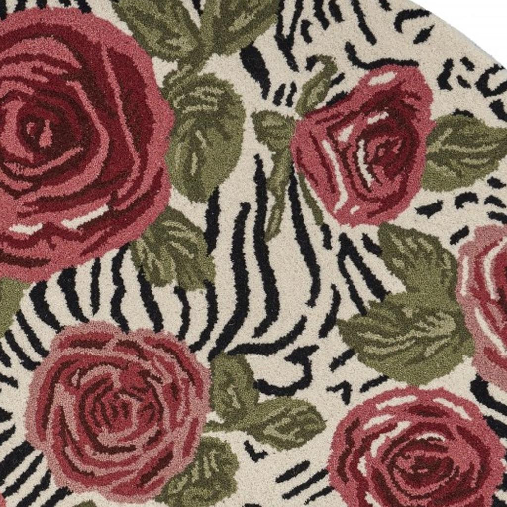 Express your innate love for roses with this lovely Round Red Rose Bed Area Rug that features floral artwork in a modern approach. Flaunting some intricately painted rose motifs in the soft shades of red with olive-toned leaves resting on a black and white zebra-printed base that is bound to grab the eyes. Incorporating wool and cotton in the making, this rug ensures a sturdy build to stand up to the elements of indoor areas without losing its shape and shine. This rug feels as luxurious as it looks due to the medium pile construction which is not only easy to clean and maintain but also soft and plush to give you a cozy underfoot. This beautifully designed nature-inspired rug will blend in with a range of interior decors without compromising the aesthetics of modern styling. 48”