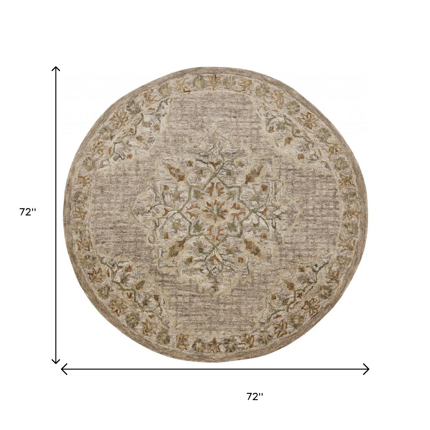 Presenting the authentic beauty of traditional styling with a vintage vibe, this Round Beige Distressed Medallion Area Rug features a subtle palette with intricate patterns. The detailing of the floral artwork in beige is imprinted on a distressed beige base that will induce a warm and comforting ambiance. Incorporating 100% wool in the making, this rug ensures durability and stain resistance to last long without getting stained while holding the cool for years to come. Made to experience a soft and cozy underfoot, this rug is constructed in a medium pile that adds to the surface texture for an inviting feel. The understated elegance of the neutral shades makes this area rug a versatile accent to be placed amidst any traditional, bohemian, or countryside setting. 72”