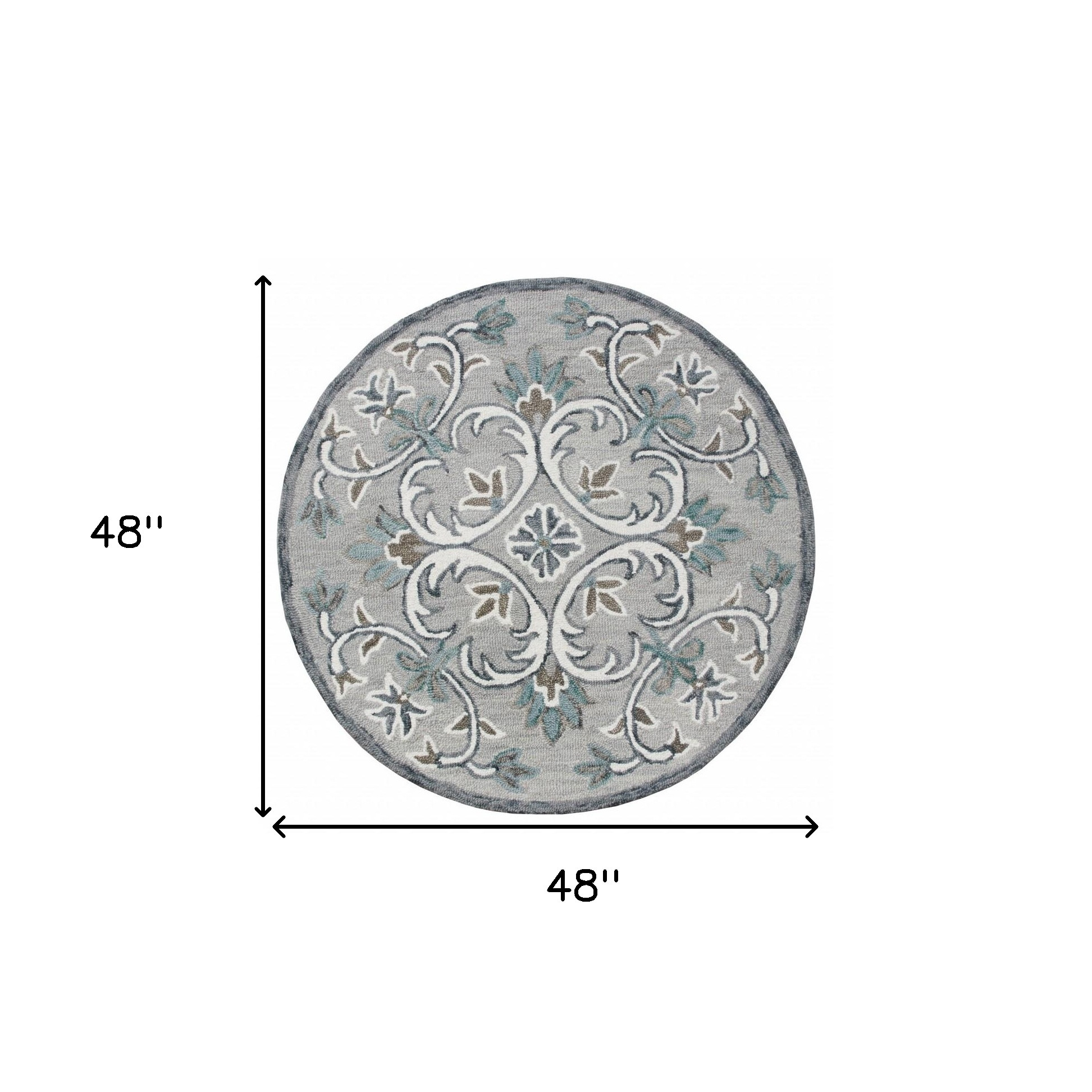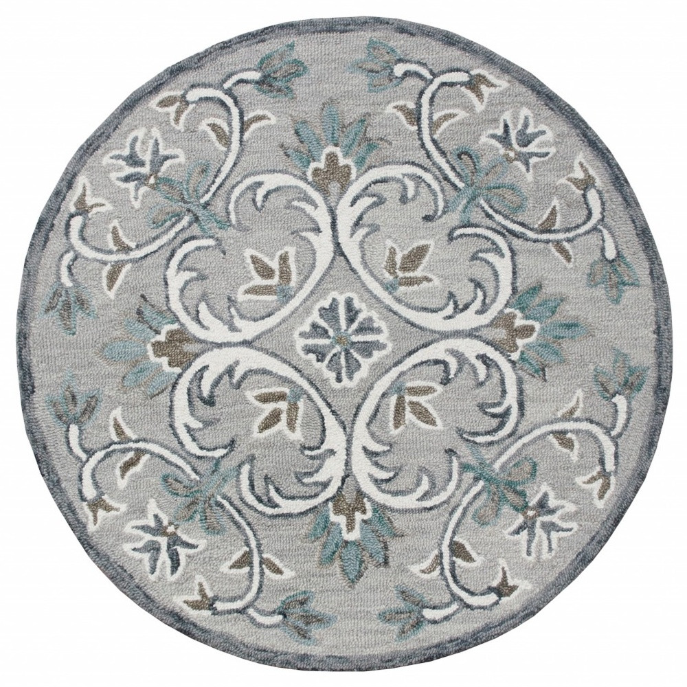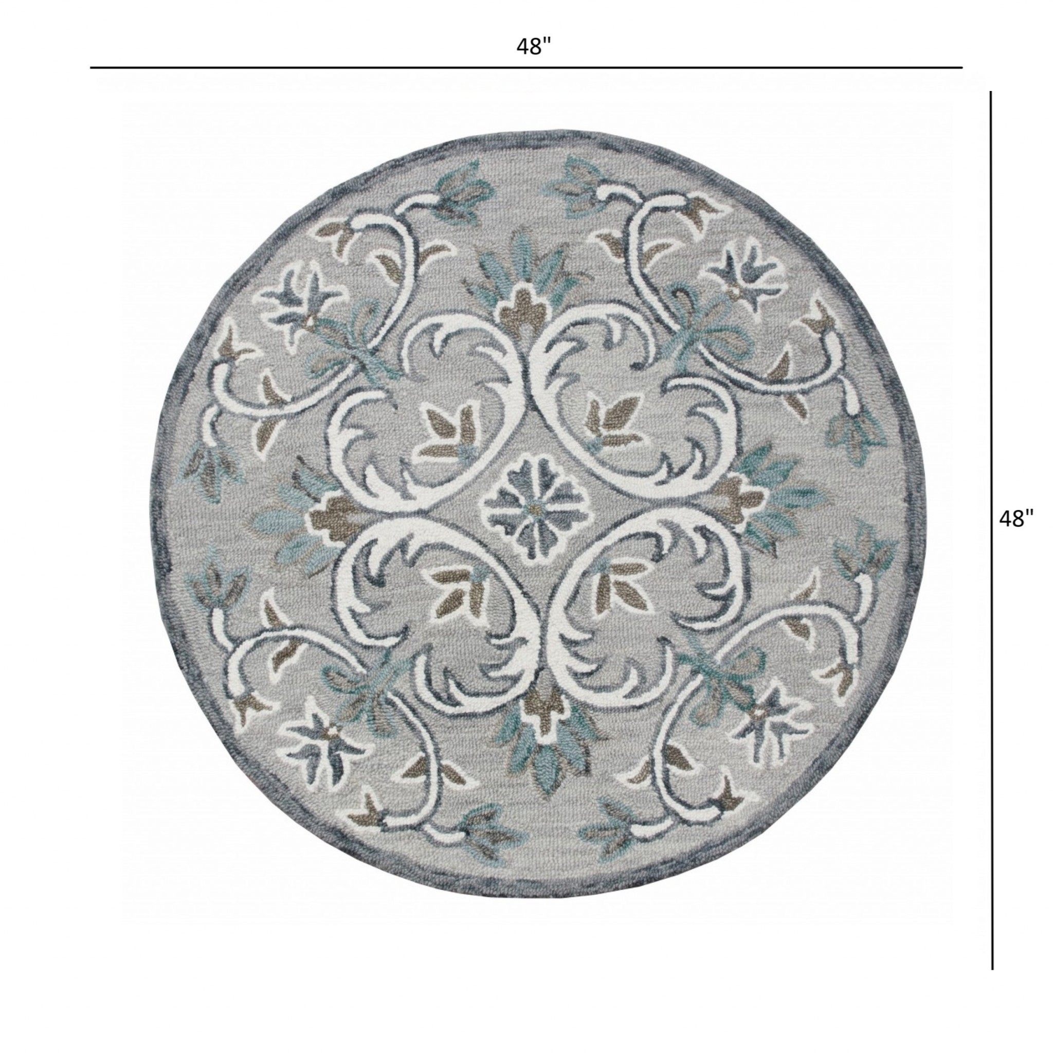 Layer your living space with this Round Gray and White Filigree Area Rug that accentuates a cool color palette with traditional patterns to blend in with a variety of interior settings. The soft tones filigree patterns are flaunted over a dove gray base with a prominent border all around for visual congruence. Hand-tufted with 100% premium wool to ensure durability and sturdiness to last for ages while being water-repellent and insulating to keep you warm in the winter and cool in the summer. The medium pile construction not only adds surface interest but also provides a luxurious feel underfoot, making it an ideal choice for busy families with children and pets. If you want a timeless accent in your place without being too loud, this round area rug is the perfect pick for you! 48”