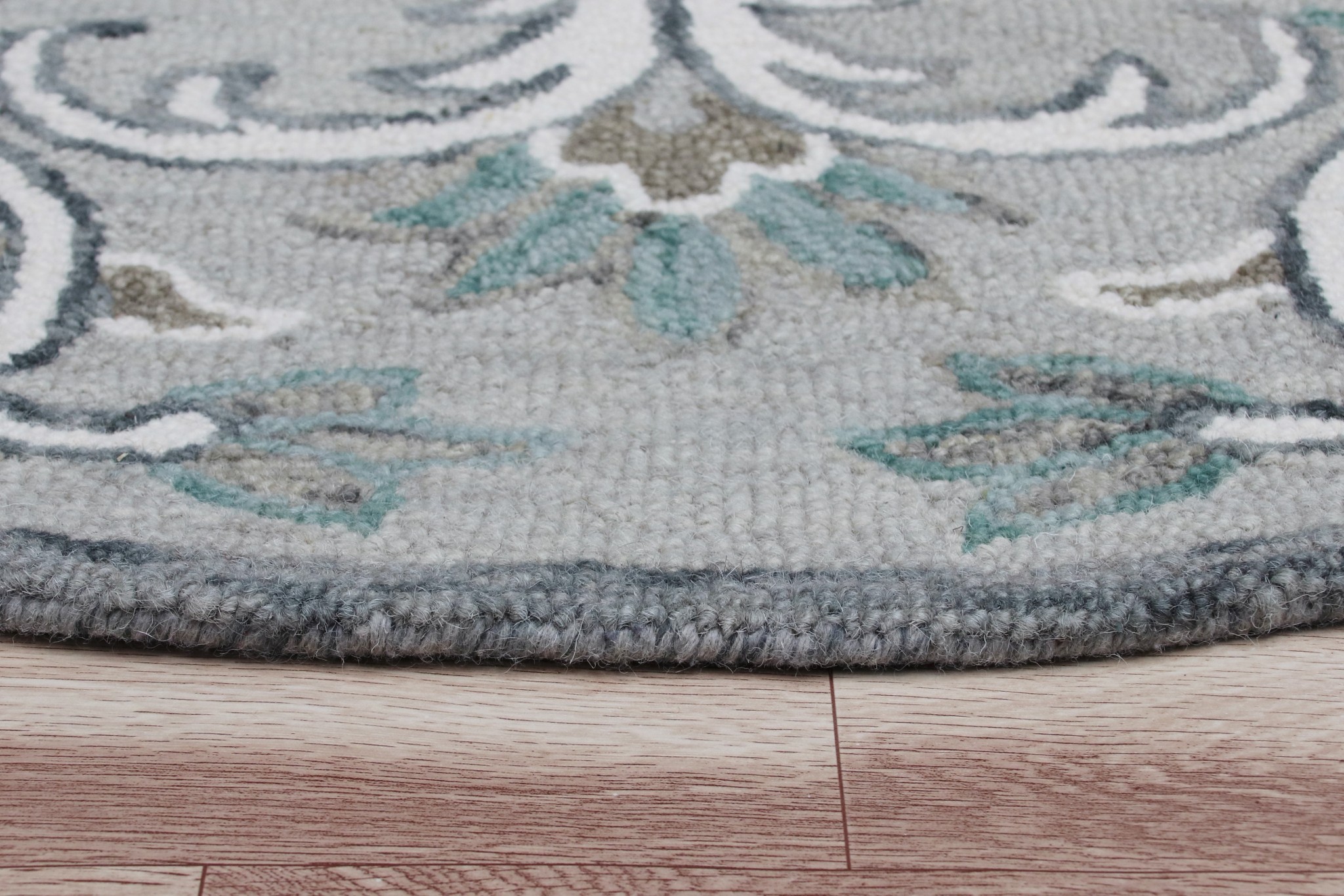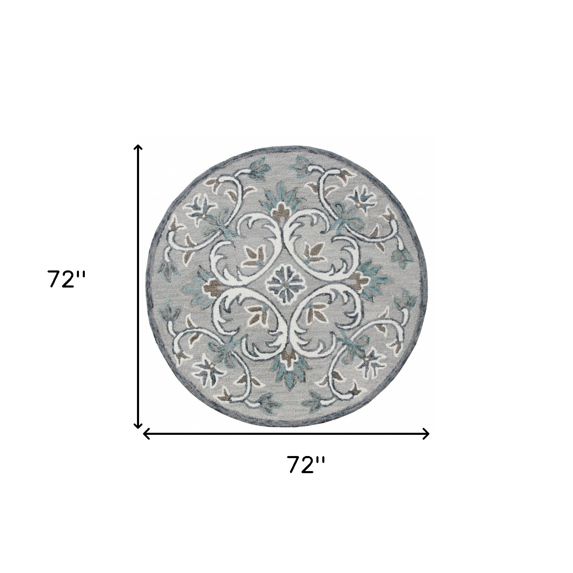 Layer your living space with this Round Gray and White Filigree Area Rug that accentuates a cool color palette with traditional patterns to blend in with a variety of interior settings. The soft tones filigree patterns are flaunted over a dove gray base with a prominent border all around for visual congruence. Hand-tufted with 100% premium wool to ensure durability and sturdiness to last for ages while being water-repellent and insulating to keep you warm in the winter and cool in the summer. The medium pile construction not only adds surface interest but also provides a luxurious feel underfoot, making it an ideal choice for busy families with children and pets. If you want a timeless accent in your place without being too loud, this round area rug is the perfect pick for you! 72”