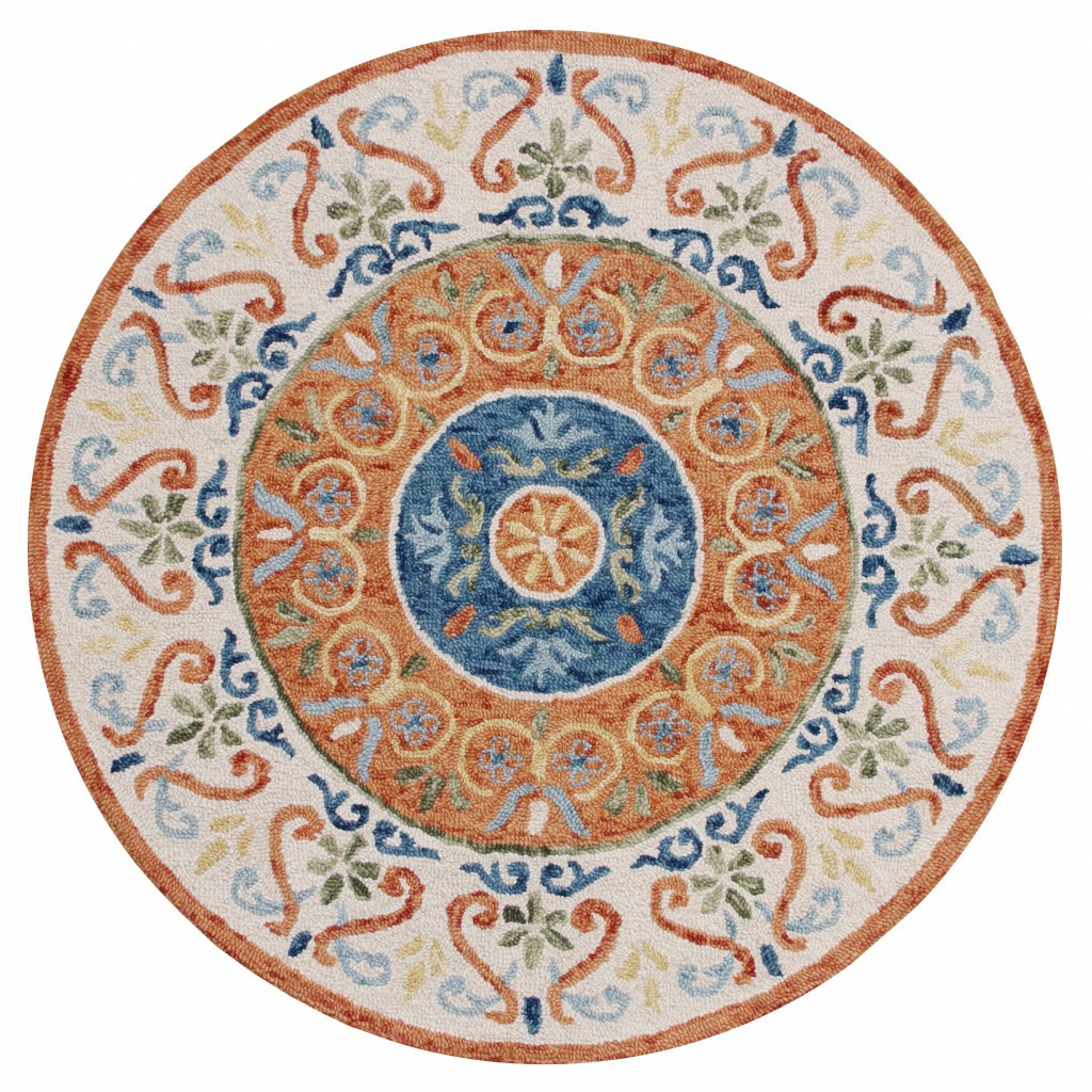 Teeming with traditional patterns in a vivid color palette, this Round Orange Traditional Medallion Area Rug will instantly spruce up your living space with a playful touch. The beautifully designed decorative patterns in burnt orange, blue, and white create a charming medallion that will entice the eye. This rug is hand-tufted with 100% wool to ensure durability and significant insulating properties, making it suitable for use in both cold and warm climates. The soft and medium pile construction provides a lustrous surface texture, making it an excellent floor accent in areas with moderate foot traffic. If you lean towards traditional elegance but need something cheerful as well, then this lovely round area rug will do the trick for you! 72”