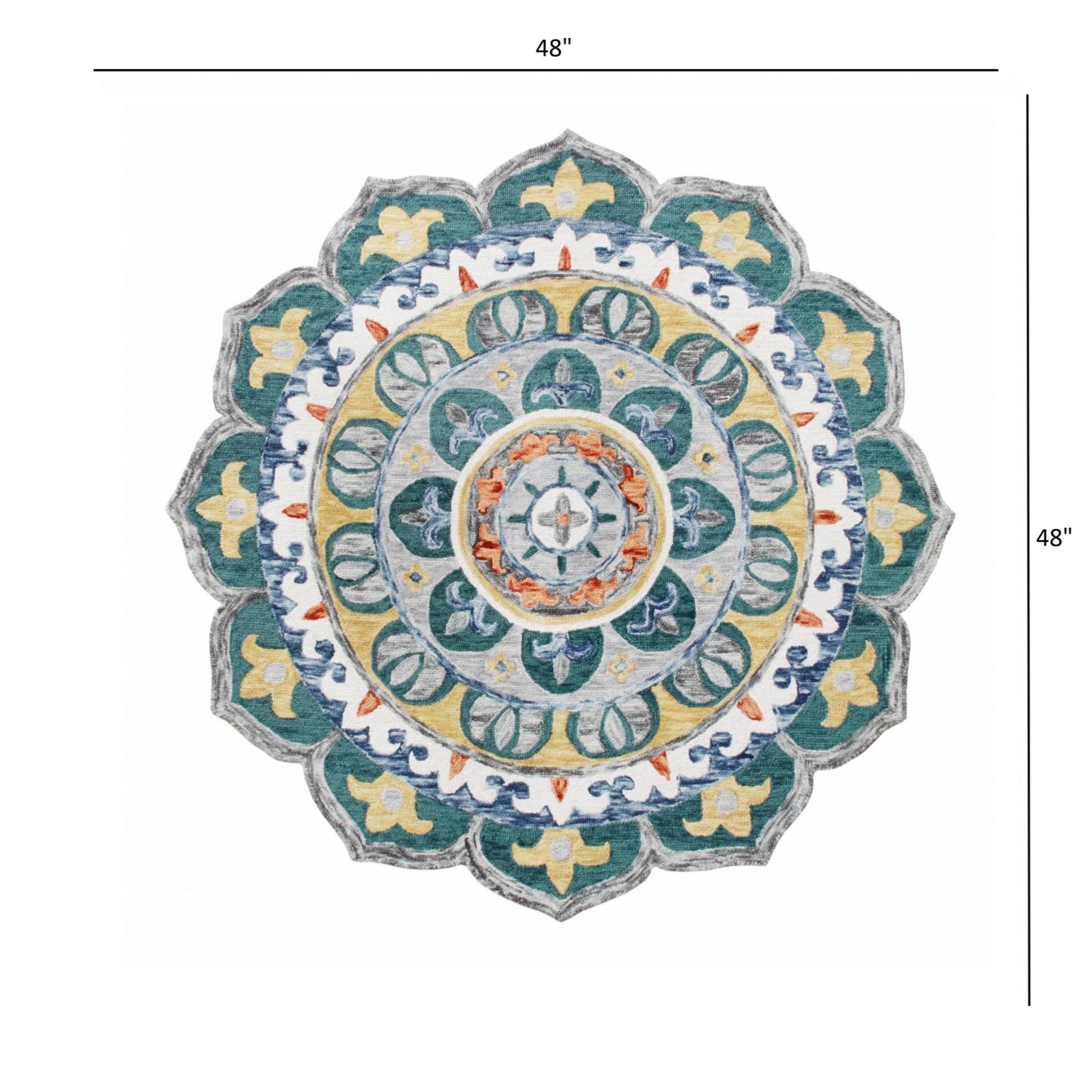 Resembling a freshly painted piece of artwork, this Round Teal Floral Mandala Area Rug will stand out in any interior setting and make the guests turn heads. The saturated shades of teal, blue, white, and pale yellow are flaunted in a beautifully designed floral mandala with petaled edges to make this piece even more captivating. Hand-tufted with 100% wool, which is naturally hardwearing and moisture-wicking and will last for years while regulating temperature in both cold and warm weather. The soft and medium pile construction adds to a luxurious surface texture for a cozy underfoot, making it a suitable option for areas with high foot traffic. The cool-toned hues of the spectrum are gorgeously presented in this area rug to spruce up any modern or traditional interior. 48”