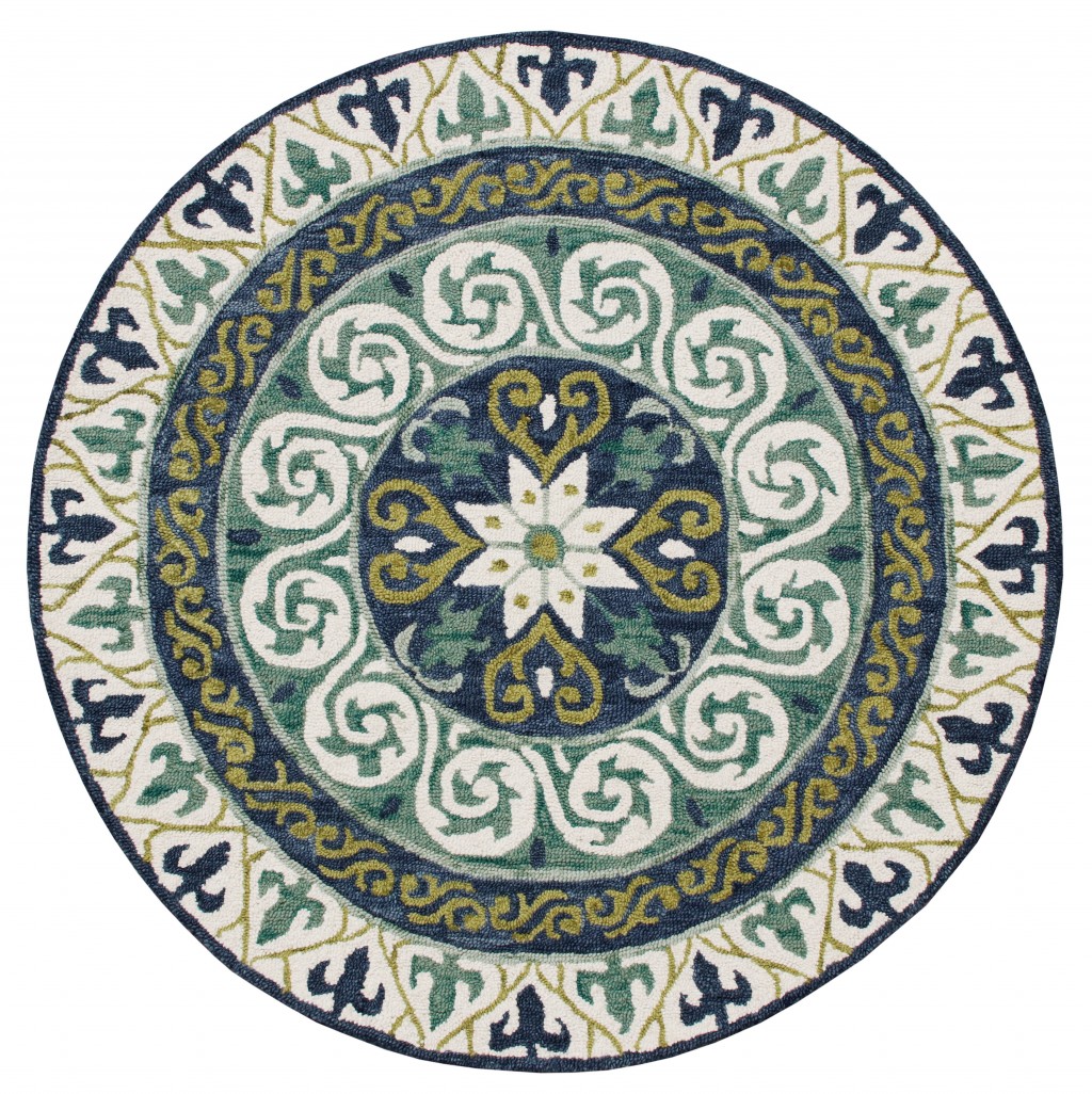 Intricately decorated in layers with an array of natural tones, this Round Blue and Green Ornate Medallion Area Rug will be an eye-catching element on the floor. The circular bands are all uniquely designed with beautiful geometric motifs in the variegated shades of sage, olive, navy, and white to allure the gaze of the guests with its traditional appeal. Made of highly durable wool and viscose blend to serve you for years and hold color to retain its shape and sheen. The low pile construction not only adds to a smooth surface texture but also makes it easy to clean, providing a soft underfoot with a silky look. The nature-inspired palette of this area rug will reinforce a sense of serenity in your place and tie together the aesthetics of your classic interior. 60”