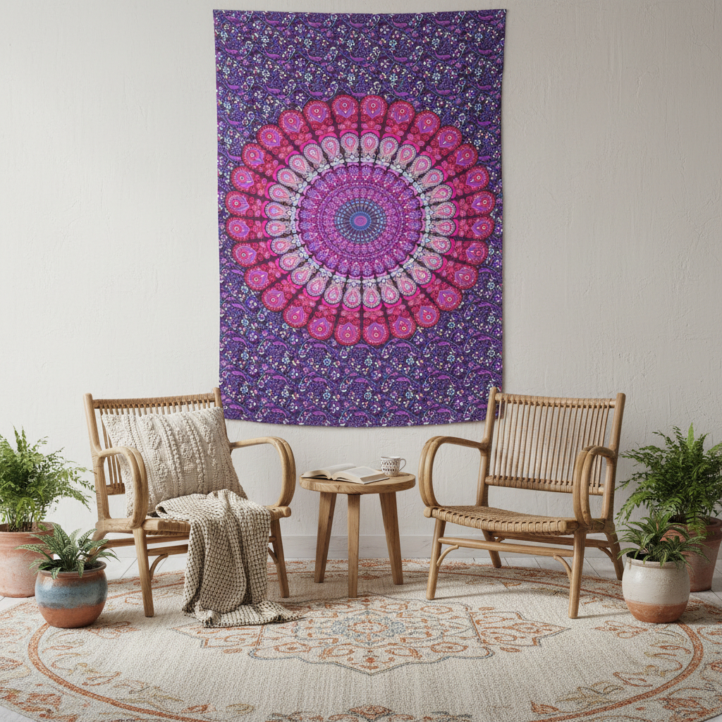 The 80-inch x 56-inch purple pink and white mandala cotton hanging tapestry is the perfect decorative accessory for your home. Easily create a focal point in your room with this generously sized bohemian decor. Handmade with care, this piece brings some authenticity to your space. Instantly liven up your space with this art that brings color and dimension to your walls. Adorn your walls in style with this bed icon art. Hang on your wall to add some up to date fashion and decoration. Utilize this opportunity to create a focal point in the room with this fabulous wall decor option. 80-inch h x 56-inch w x 0.2-inch d.