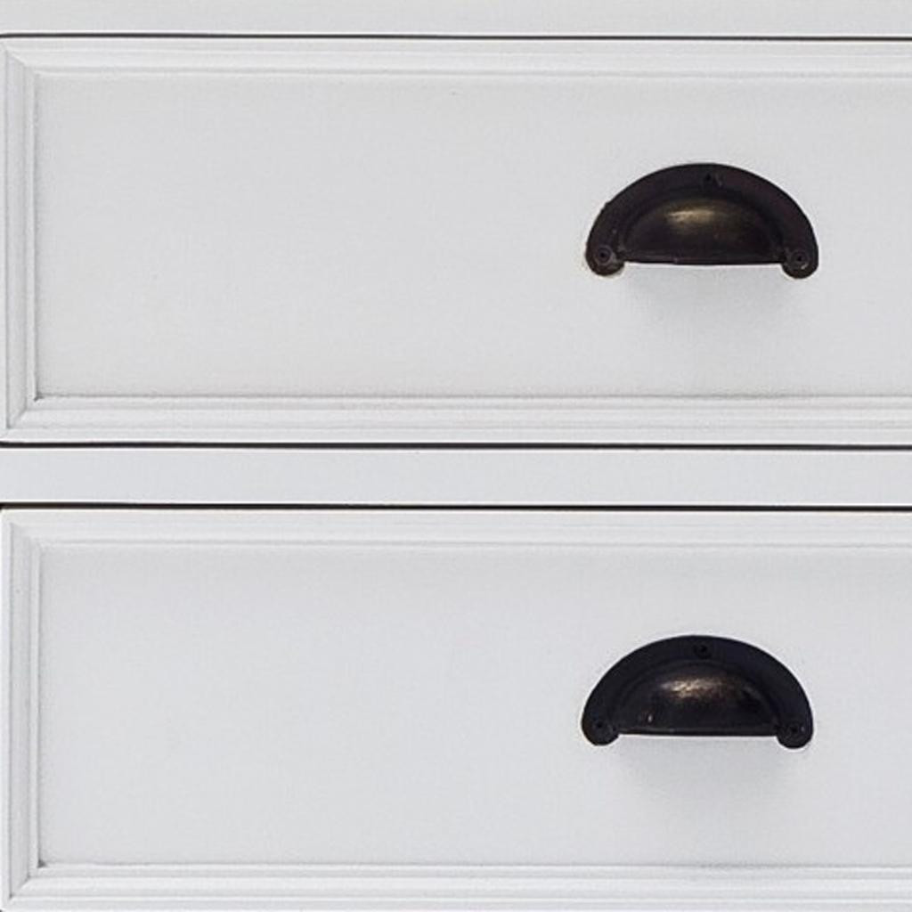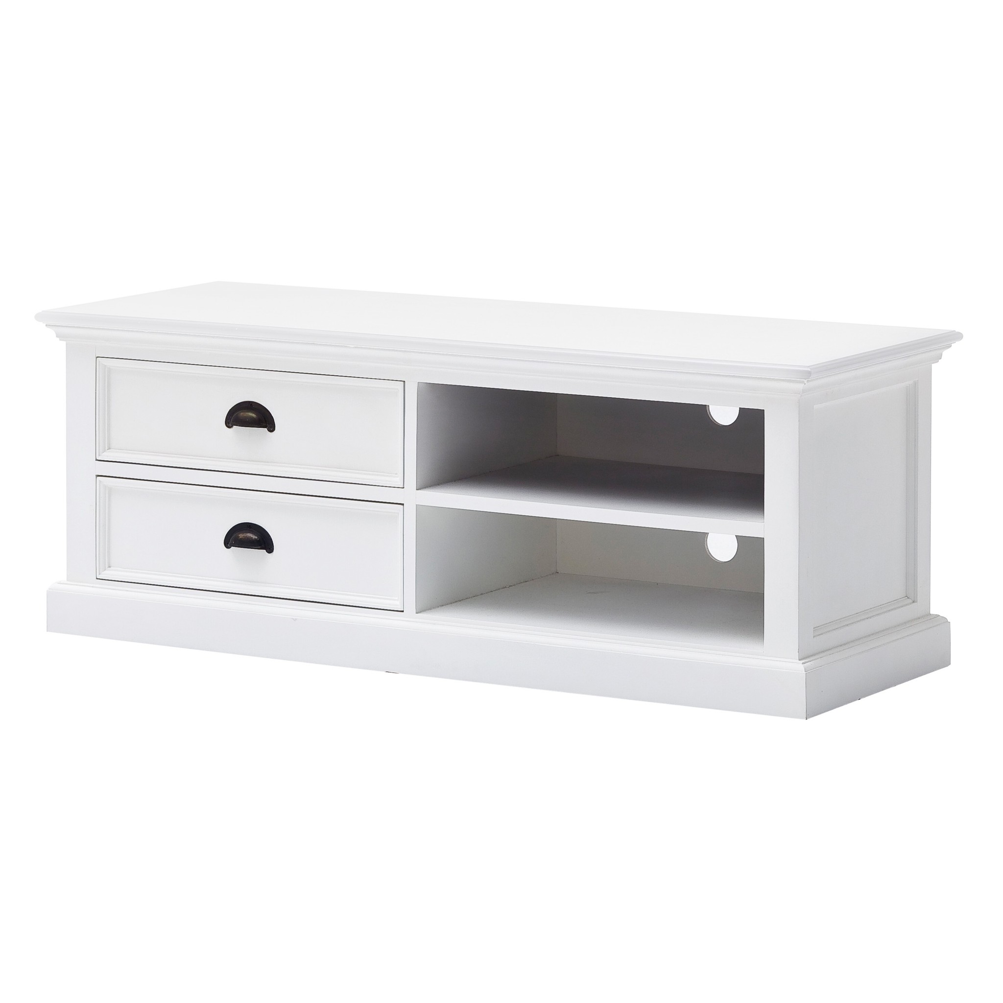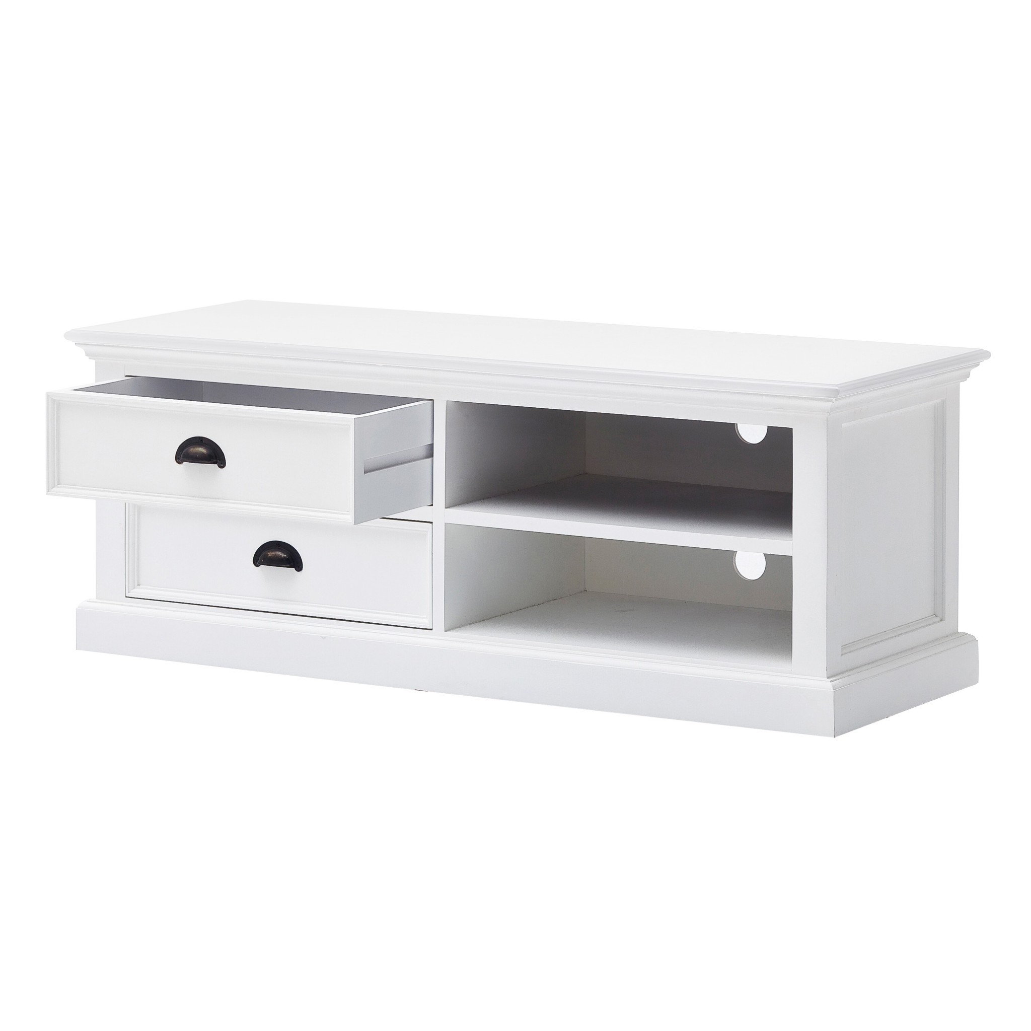 This classic White Entertainment Unit with Two Drawers is the perfect example of form and function. Hand-crafted from mahogany wood with a semi-gloss white paint finish the table hits the vintage spot with it's flared crown moldings, moulded plinth base, beveled drawers and antiqued brass cup handles. Expertly equipped with two drawers and two open shelves, it provides an adequate amount of space to store all your media components, gadgets and even personal belongings. 17.72" x 47.24"" x 17.72"