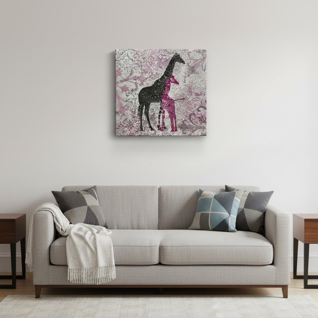 This exotic pink giraffes unframed print wall art will add a beautiful decorative accent to your decor. This print is a visual artistic expression that allows you to decorate your space in style. Reproduced for you on canvas, this hanging decorative accent will be a trendy and fashionable way to dress your walls. Adding this hanging wall art to your space to make your room feel more finished and attractive. Instantly liven up your space with this art that brings color and dimension to your walls. 40 inches H x 40 inches W x 1.25 inches D
