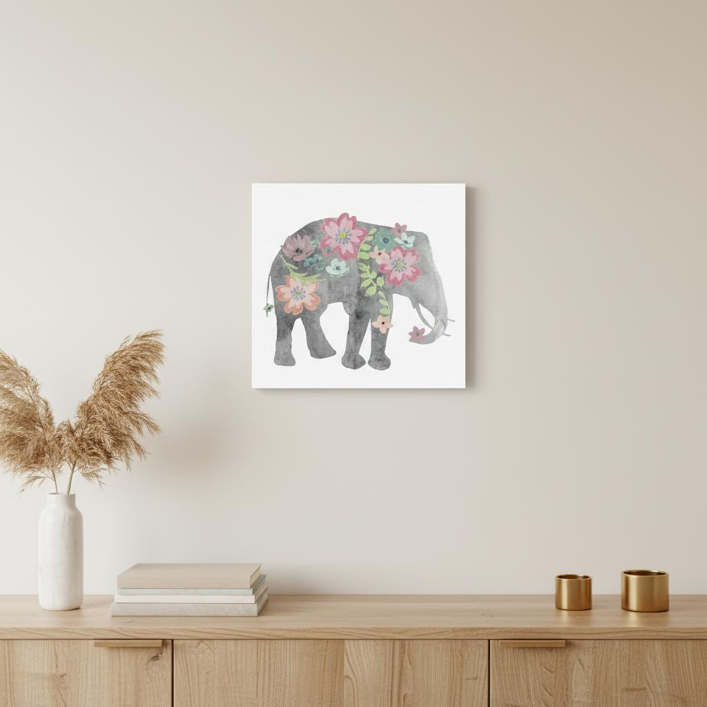 Bring some sizzle to your space with this eye-catching floral elephant unframed print wall art. This print is a visual artistic expression that allows you to decorate your space in style. Reproduced for you on canvas, this hanging decorative accent will be a trendy and fashionable way to dress your walls. Adding this hanging wall art to your space to make your room feel more finished and attractive. Utilize this opportunity to create a focal point in the room with this fabulous wall decor option. 20 inches H x 20 inches W x 1.25 inches D