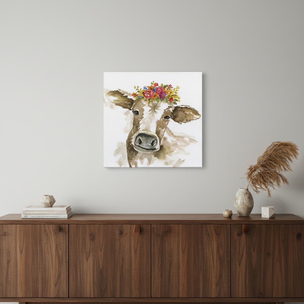 Bring some sizzle to your space with this eye-catching watercolor floral cow unframed print wall art. This print is a visual artistic expression that allows you to decorate your space in style. Reproduced for you on canvas, this hanging decorative accent will be a trendy and fashionable way to dress your walls. Adding this hanging wall art to your space to make your room feel more finished and attractive. Utilize this opportunity to create a focal point in the room with this fabulous wall decor option. 30 inches H x 30 inches W x 1.25 inches D