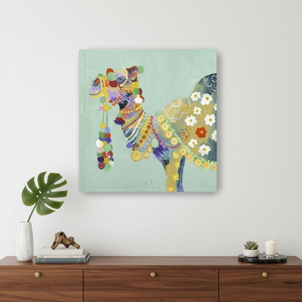 Bring some sizzle to your space with this eye-catching moroccan party camel unframed print wall art. This print is a visual artistic expression that allows you to decorate your space in style. Reproduced for you on canvas, this hanging decorative accent will be a trendy and fashionable way to dress your walls. Hang on your wall to add some up to date fashion and decoration. Instantly liven up your space with this art that brings color and dimension to your walls. 30 inches H x 30 inches W x 1.25 inches D