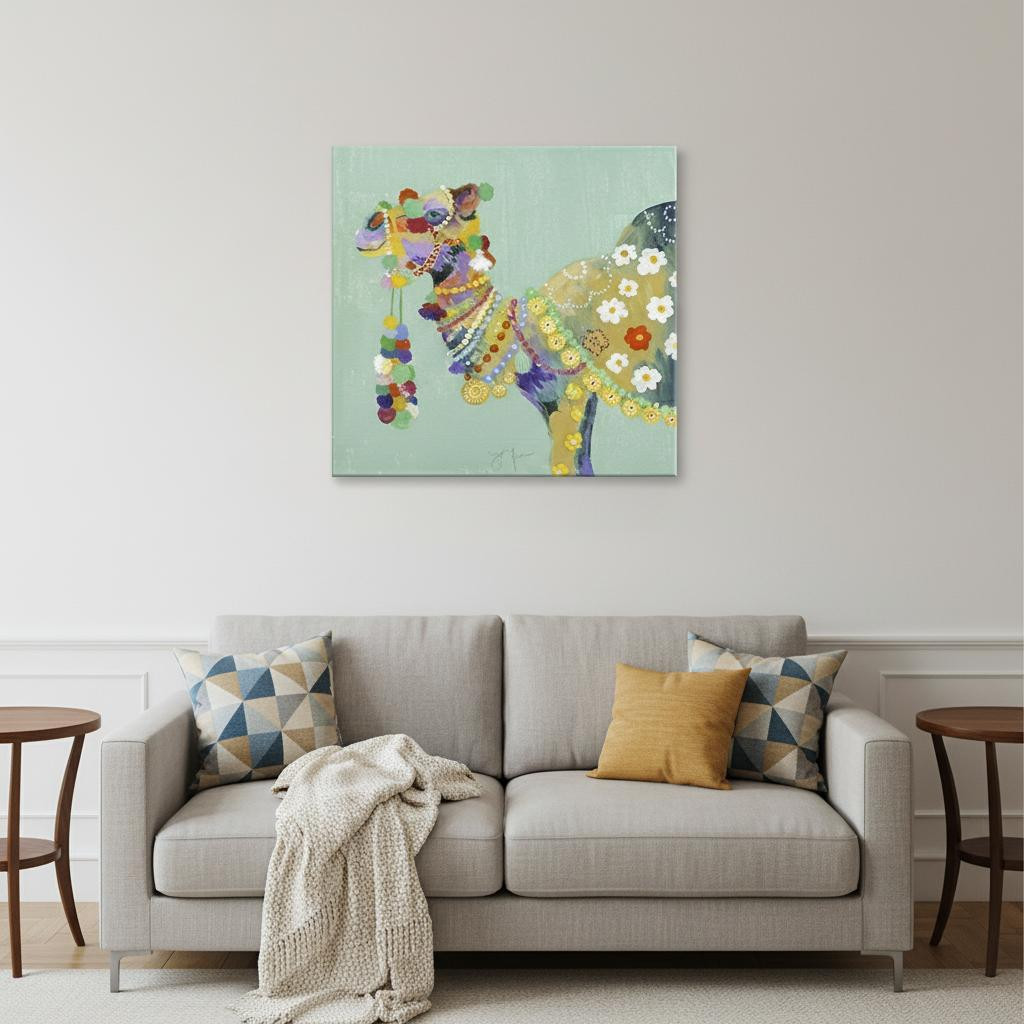 Add an air of fashion to your room and rejuvenate the space with this moroccan party camel unframed print wall art. This print is a visual artistic expression that allows you to decorate your space in style. Reproduced for you on canvas, this hanging decorative accent will be a trendy and fashionable way to dress your walls. Adding this hanging wall art to your space to make your room feel more finished and attractive. Utilize this opportunity to create a focal point in the room with this fabulous wall decor option. 40 inches H x 40 inches W x 1.25 inches D