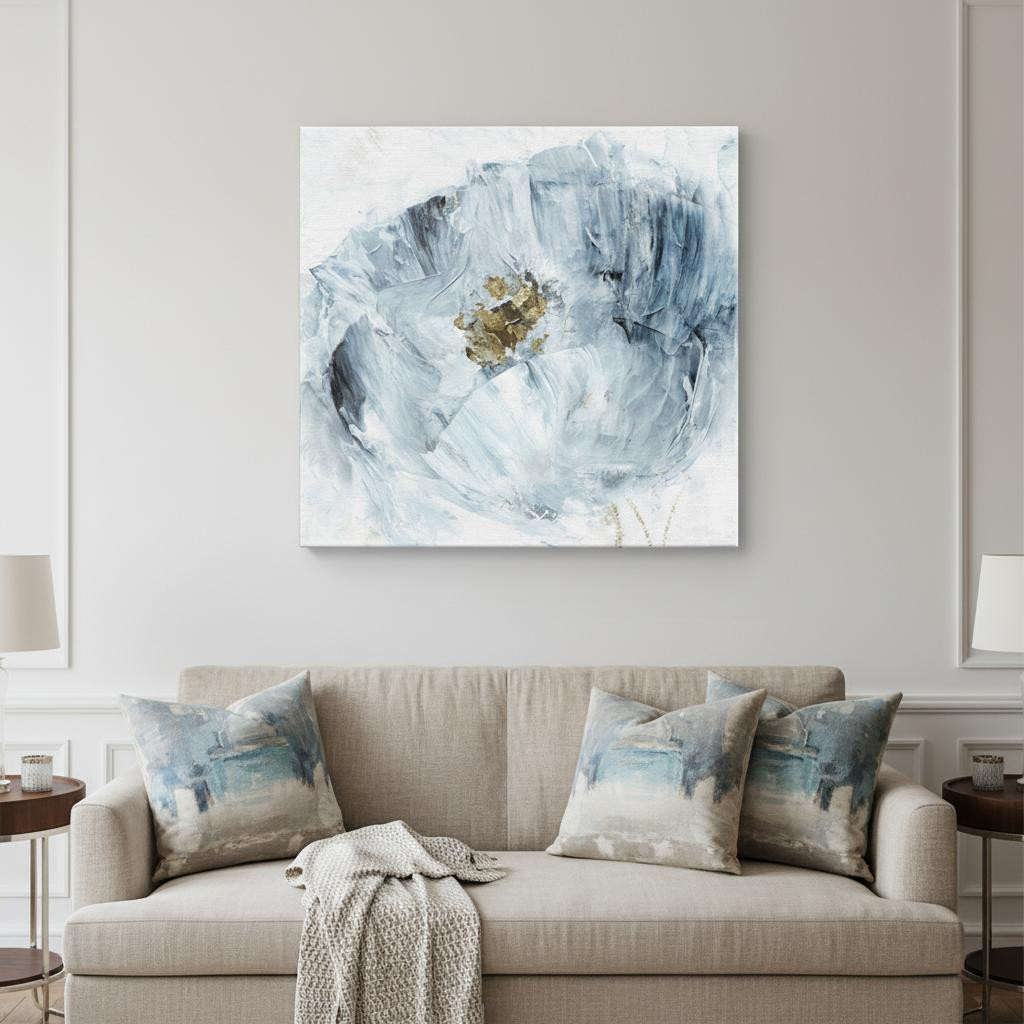 Bring some sizzle to your space with this eye-catching gray and blue unframed flower wall art. Reproduced for you on canvas, this hanging decorative accent will be a trendy and fashionable way to dress your walls. Hang on your wall to add some up to date fashion and decoration. Utilize this opportunity to create a focal point in the room with this fabulous wall decor option. 40.00-inch h x 40.00-inch w x 1.25-inch d.
