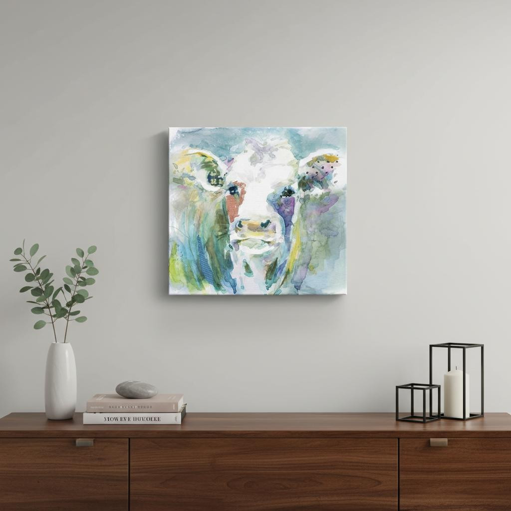 Unique and decorative, this watercolor cow unframed print wall art will leave a lasting impression. This print is a visual artistic expression that allows you to decorate your space in style. Reproduced for you on canvas, this hanging decorative accent will be a trendy and fashionable way to dress your walls. Adding this hanging wall art to your space to make your room feel more finished and attractive. Instantly liven up your space with this art that brings color and dimension to your walls. 20 inches H x 20 inches W x 1.25 inches D