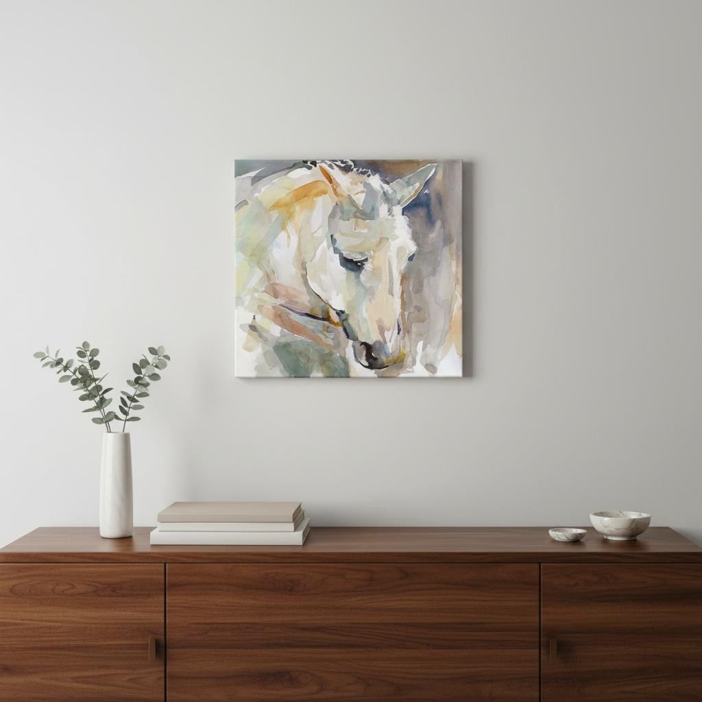 The 20 inches x 20 inches abstract watercolor horse canvas wall art is the perfect decorative accessory for your home. This print is a visual artistic expression that allows you to decorate your space in style. Reproduced for you on canvas, this hanging decorative accent will be a trendy and fashionable way to dress your walls. Hang on your wall to add some up to date fashion and decoration. Utilize this opportunity to create a focal point in the room with this fabulous wall decor option. 20 inches H x 20 inches W x 1.25 inches D