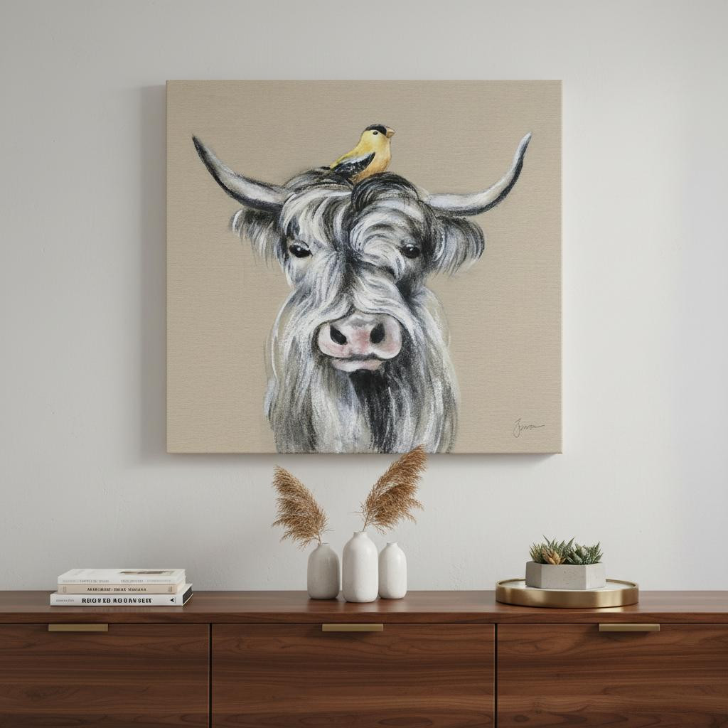 Add an air of fashion to your room and rejuvenate the space with this cute highland cow unframed print wall art. This print is a visual artistic expression that allows you to decorate your space in style. Reproduced for you on canvas, this hanging decorative accent will be a trendy and fashionable way to dress your walls. Hang on your wall to add some up to date fashion and decoration. Instantly liven up your space with this art that brings color and dimension to your walls. 20 inches H x 20 inches W x 1.25 inches D